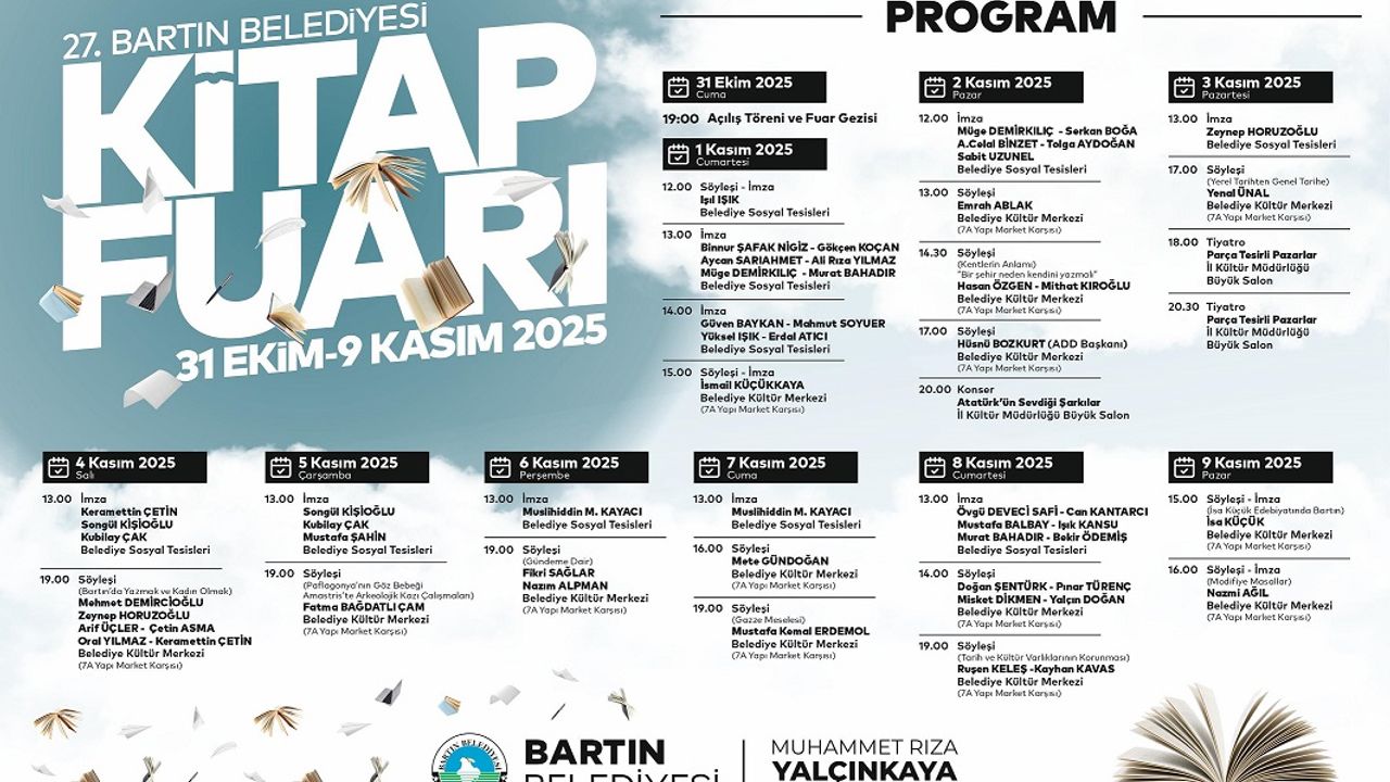 Açılış töreni 31 Ekim 2025 Cuma Günü Saat 19.00‘da Belediye Sosyal Tesisleri’nde gerçekleşecek olan Bartın Belediyesi 27. Kitap Fuarı’nın programı şu şekilde;