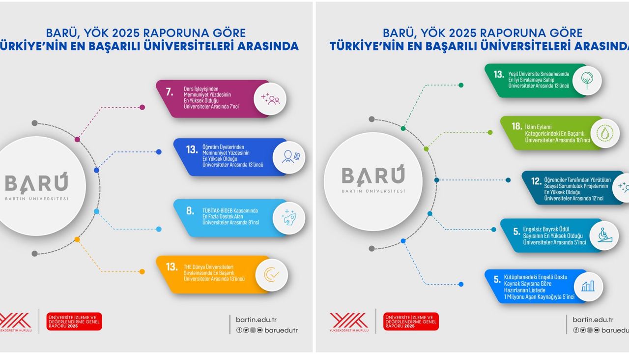 Bartın Üniversitesi (BARÜ) Yükseköğretim Kurulu (YÖK) tarafından yayımlanan "Üniversite İzleme ve Değerlendirme Genel Raporu-2025"e göre 9 farklı göstergede ilk 20’de yer aldı.