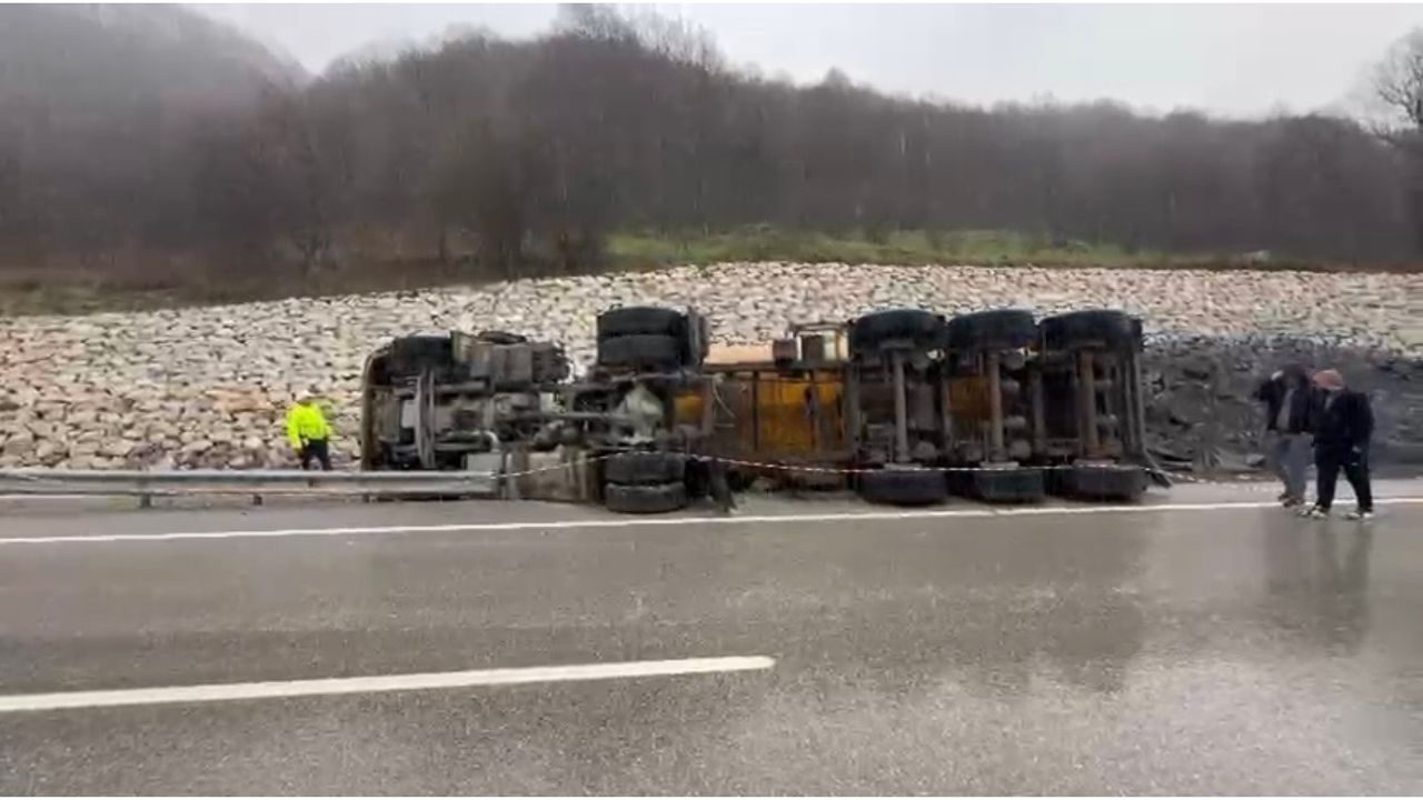 Kaza, Uğurlar Kavşağı’nda meydana geldi. Edinilen bilgilere göre, kömür yüklü kamyon sürücüsünün direksiyon hâkimiyetini kaybetmesi sonucu devrildi.