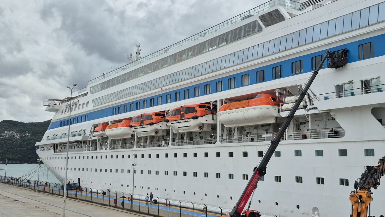 Rusya'dan yolcu taşıyan dev Astoria Grande gemisi, geldiği Amasra Limanı'nda filikaları indirip, testlerden geçirilirken, geminin gövdesinde genel bakım gerçekleştirildi.