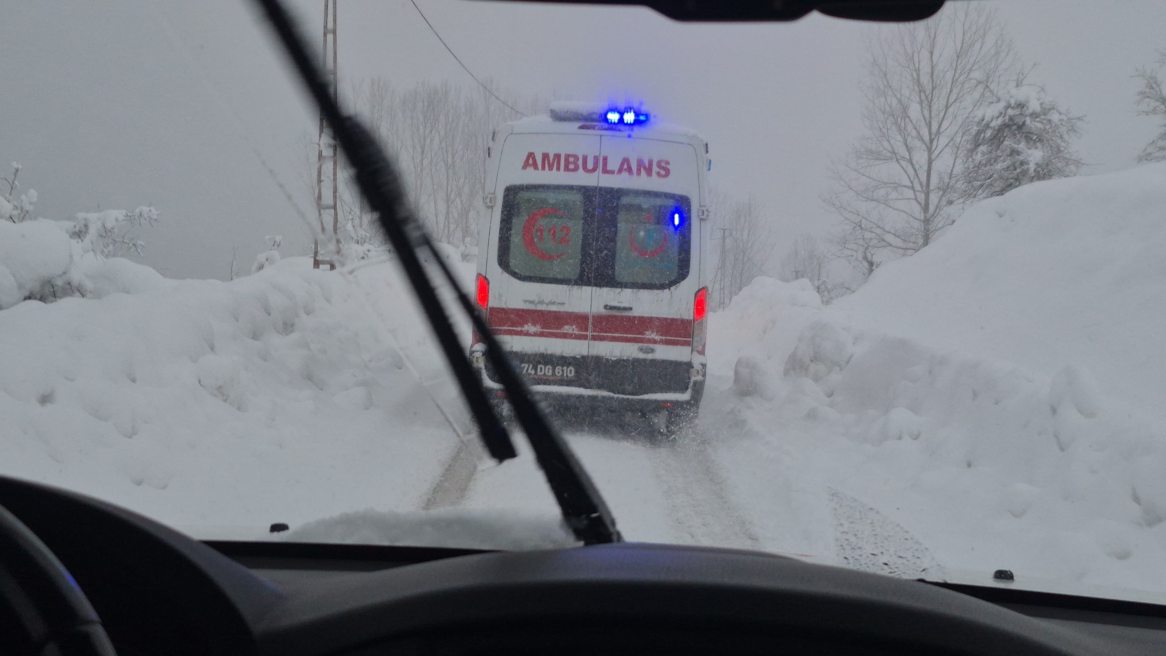 Bartın Sağlık Müdürlüğü Acil Sağlık Hizmetleri ambulansı, yolda 25 santimetreyi aşan kar, tipi ve buzlanma gibi nedenlerden hastaya ulaşamadı. Bunun üzerine bölgeye İl Özel İdaresi'ne ait iş makineleri yönlendirilirken, saat 14:30 sıralarında bölgeye paletli ambulans yönlendirildi