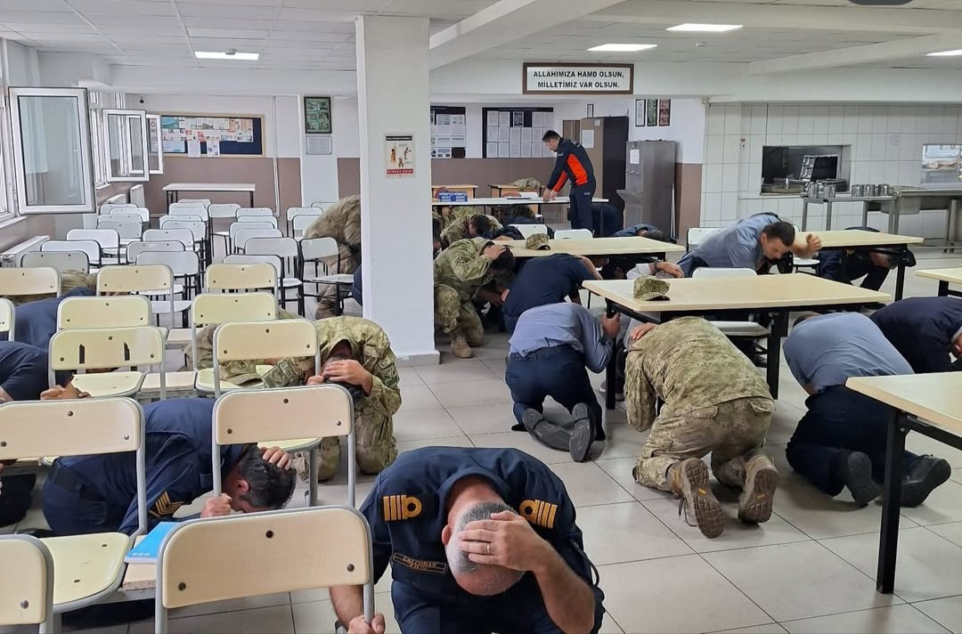Teorik bilgilerin ardından uygulamalı olarak tatbikata katılan komutanlık personeli çök kapan tütün hareketinin ardından binadan başarıyla tahliye edildi