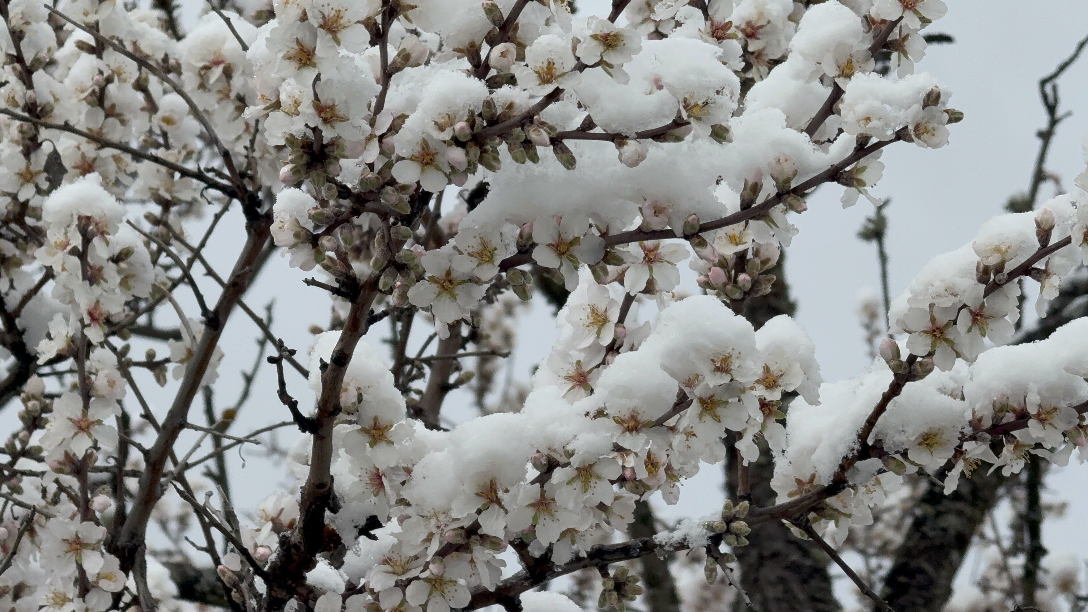 Çiçeklerle kaplı dalların üzerini örten kar tabakası, zirai açıdan olumsuzluk ihtimalini de beraberinde getirdi.