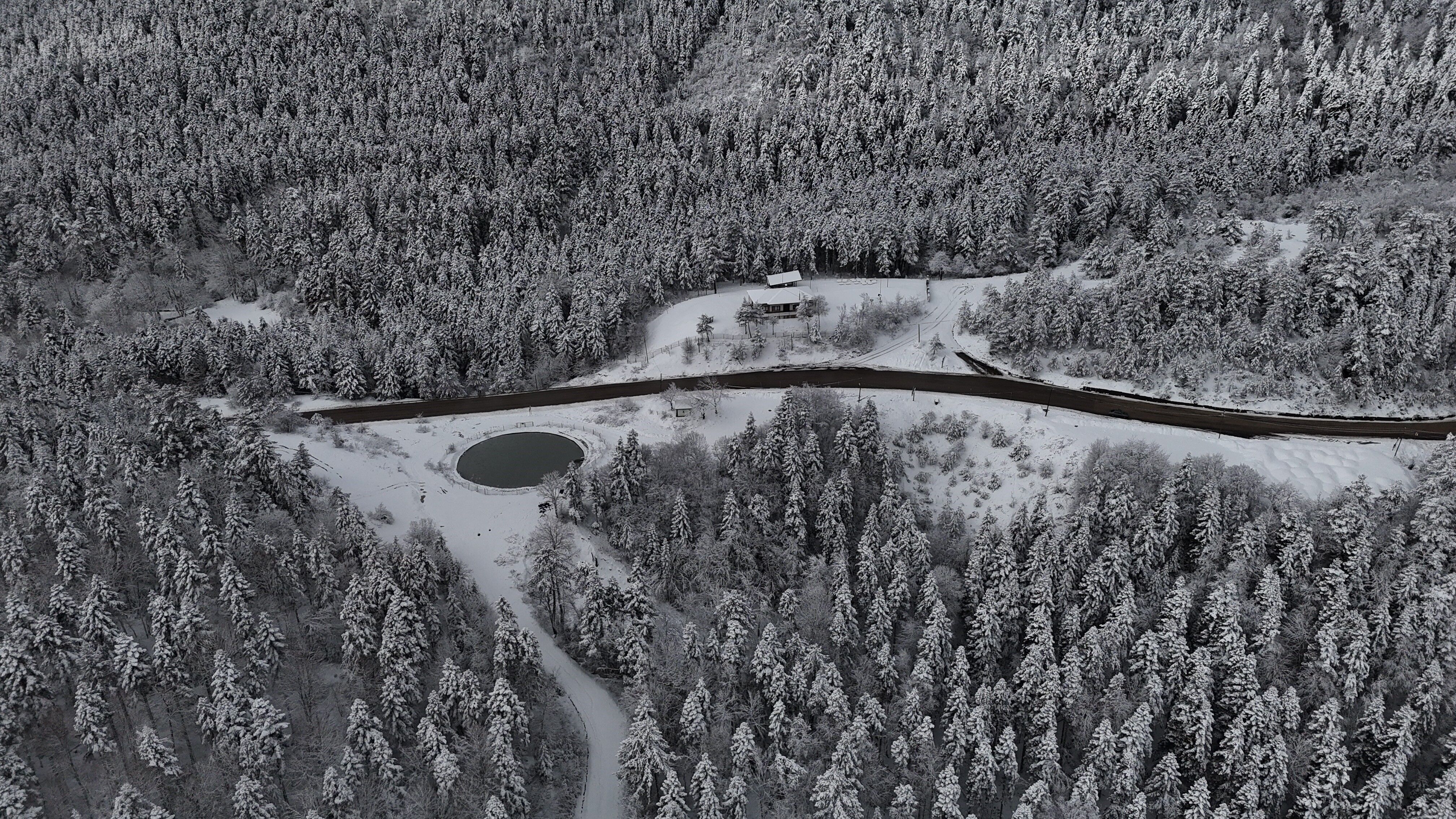 Beyaz örtüyle kaplanan doğa, dronla havadan görüntülendi.