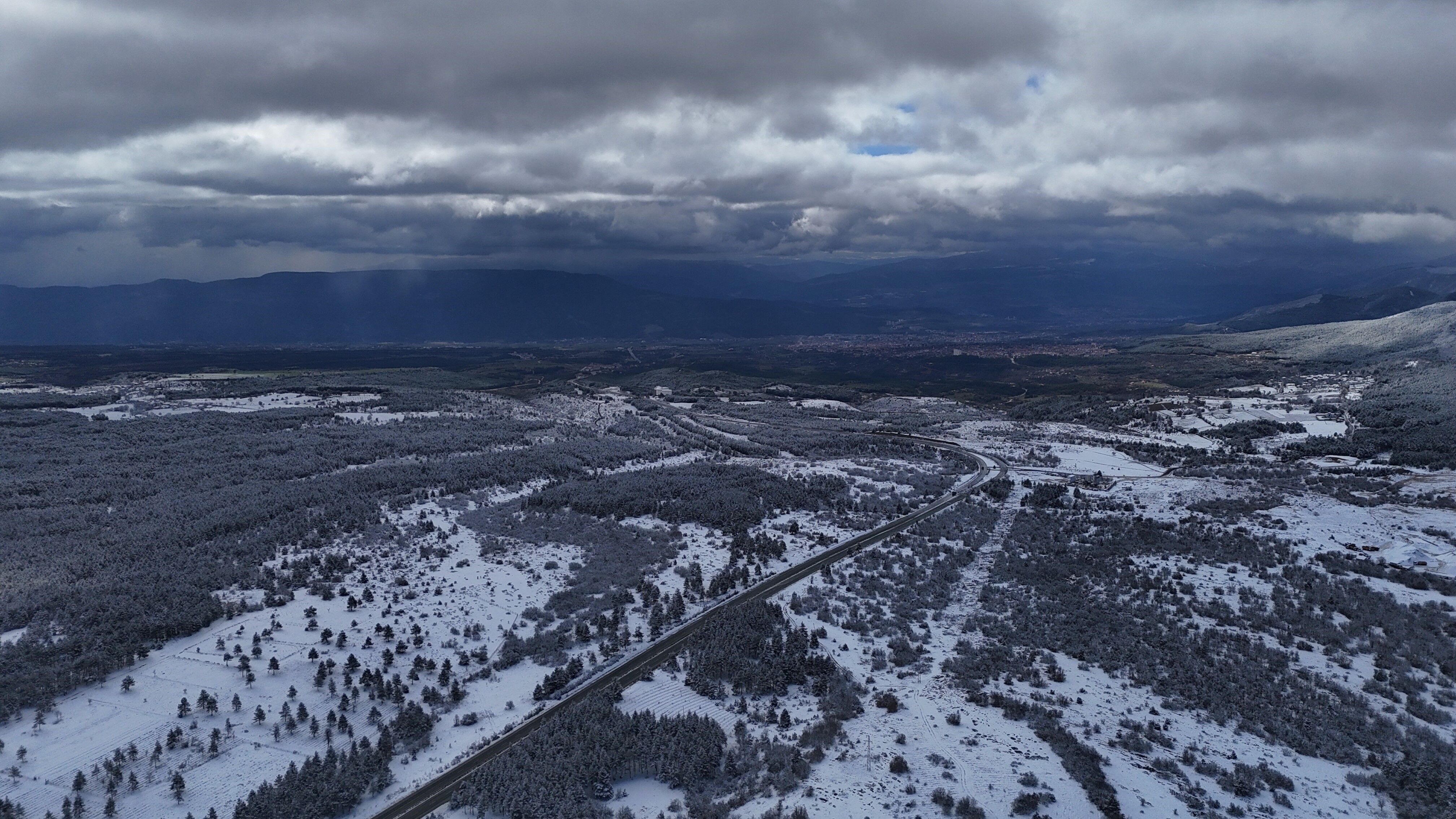 Karabük'ün yüksek kesimlerinde kar yağışı sonrası oluşan beyaz örtü, güneşin açmasıyla birlikte eşsiz manzaralar oluştururken o anlar dronla görüntülendi.