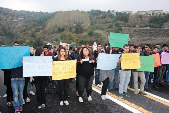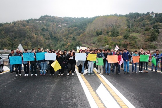 BARTIN’IN AMASRA İLÇESİNDE TRAFİĞE KAPALI OLAN TÜNEL BAĞLANTI YOLUNDA 1 HAFTA ÖNCE MEYDANA GELEN KAZADA HAYATINI KAYBEDEN LİSE SON SINIF ÖĞRENCİSİ ONUR TOPRAKDELEN’İN ARKADAŞLARI, KAZANIN MEYDANA GELDİĞİ YOLDA İKİNCİ KEZ EYLEM YAPTI. (HALİL TEKİN/BARTIN-İHA)