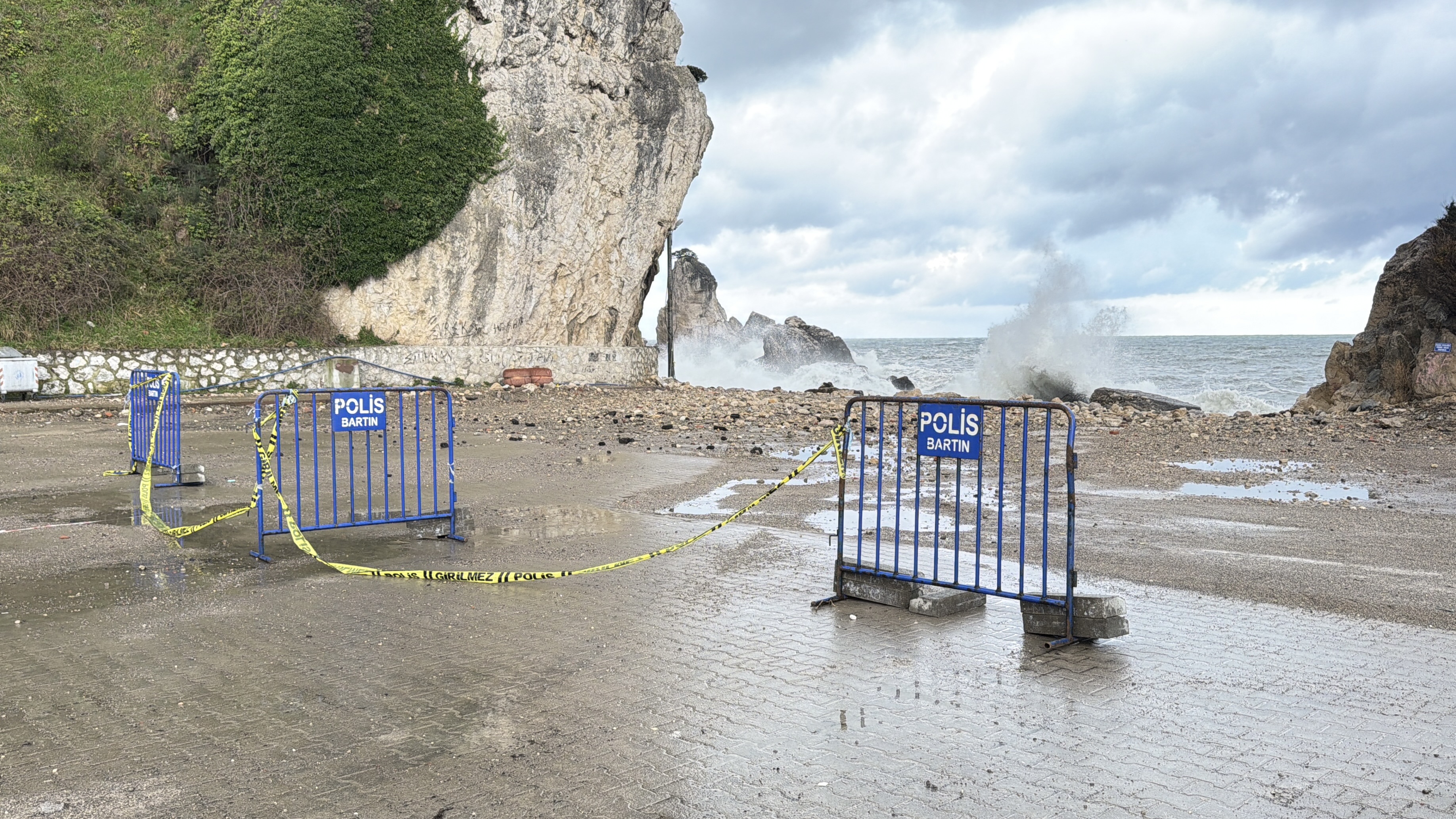 Amasra Küçük Liman'da dalgalar, kaldırım taşlarını yerinden söktü, otopark alanına zarar verdi. Polis ekipleri, şerit çekerek alana girişleri kapattı.