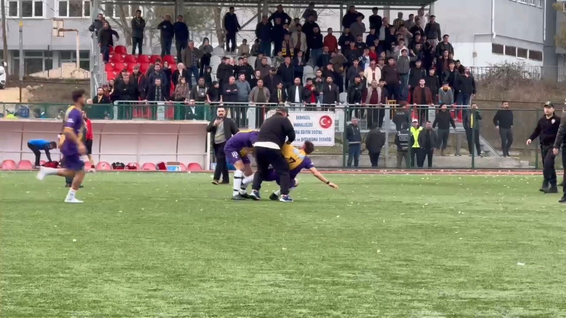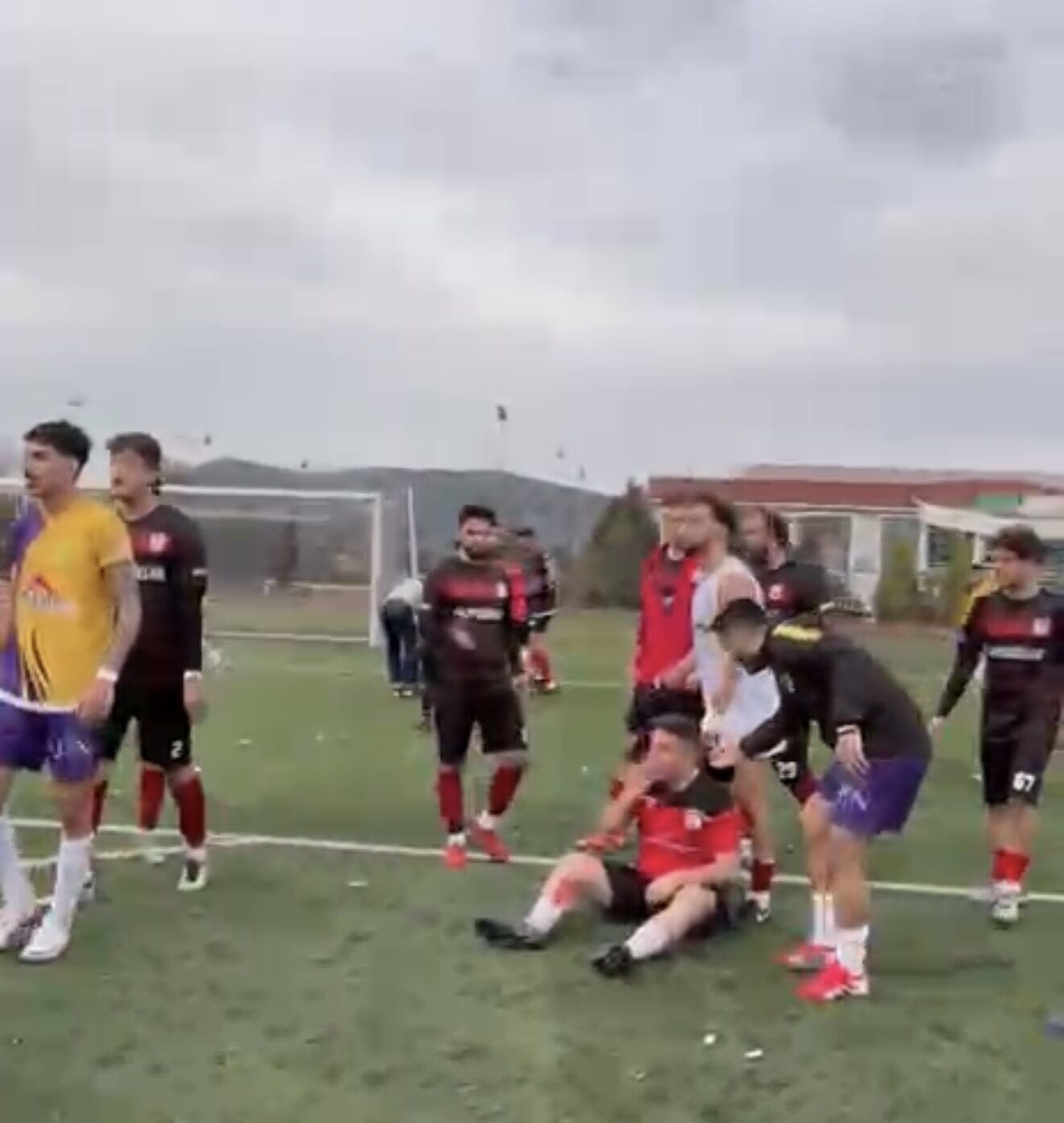 BARTIN'da 1’inci Amatör Lig'de Arıt Kayadibispor-Ulus Çınarspor maçının uzatmaları oynandığı sırada saha içinde çıkan kavgada Arıt Kayadibispor'dan bir oyuncu yaralandı. Tekmelerin ve yumrukların havada uçuştuğu kavga cep telefonu ile görüntüledi.
