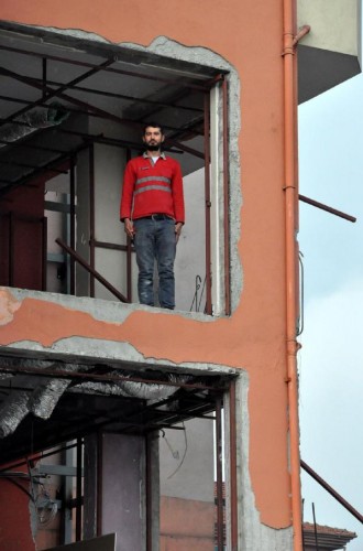 BARTIN'DA ATATURK'U ANMA TORENINDE SIRENLERIN CALMASIYLA CADDEDEKI INSAATTA CALISAN ISCILER SAYGI DURUSUNA KATILDI. FOTO-AYHAN ACAR-BARTIN-DHA