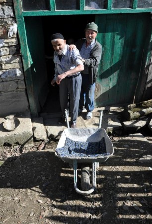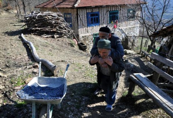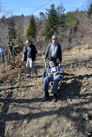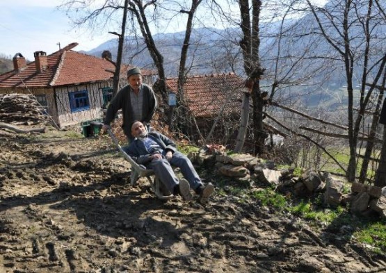 NURI ORHAN, SOL KOLU YANAN EPILEPSI HASTASI BABASI SABAN ORHAN'I, HAFTANIN 3 GUNU 1 KILOMETRE EL ARABASINDA TASIYARAK SAGLIK OCAGINA PANSUMANA GOTURUYOR. FOTO-AYHAN ACAR-BARTIN-DHA