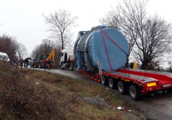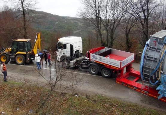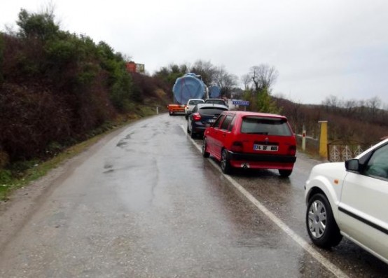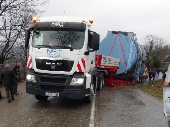 50 TONLUK HAVALANDIRMA PERVANESI TASIYAN TIR'IN DORSE BOLUMU, VIRAJI DONERKEN YOLA OTURDU. TIR, IS MAKINESIYLE CEKILEREK KURTARILMAYA CALISILIRKEN, YOLDA ARAC KONVOYU OLUSTU. FOTO-AYHAN ACAR-BARTIN-DHA