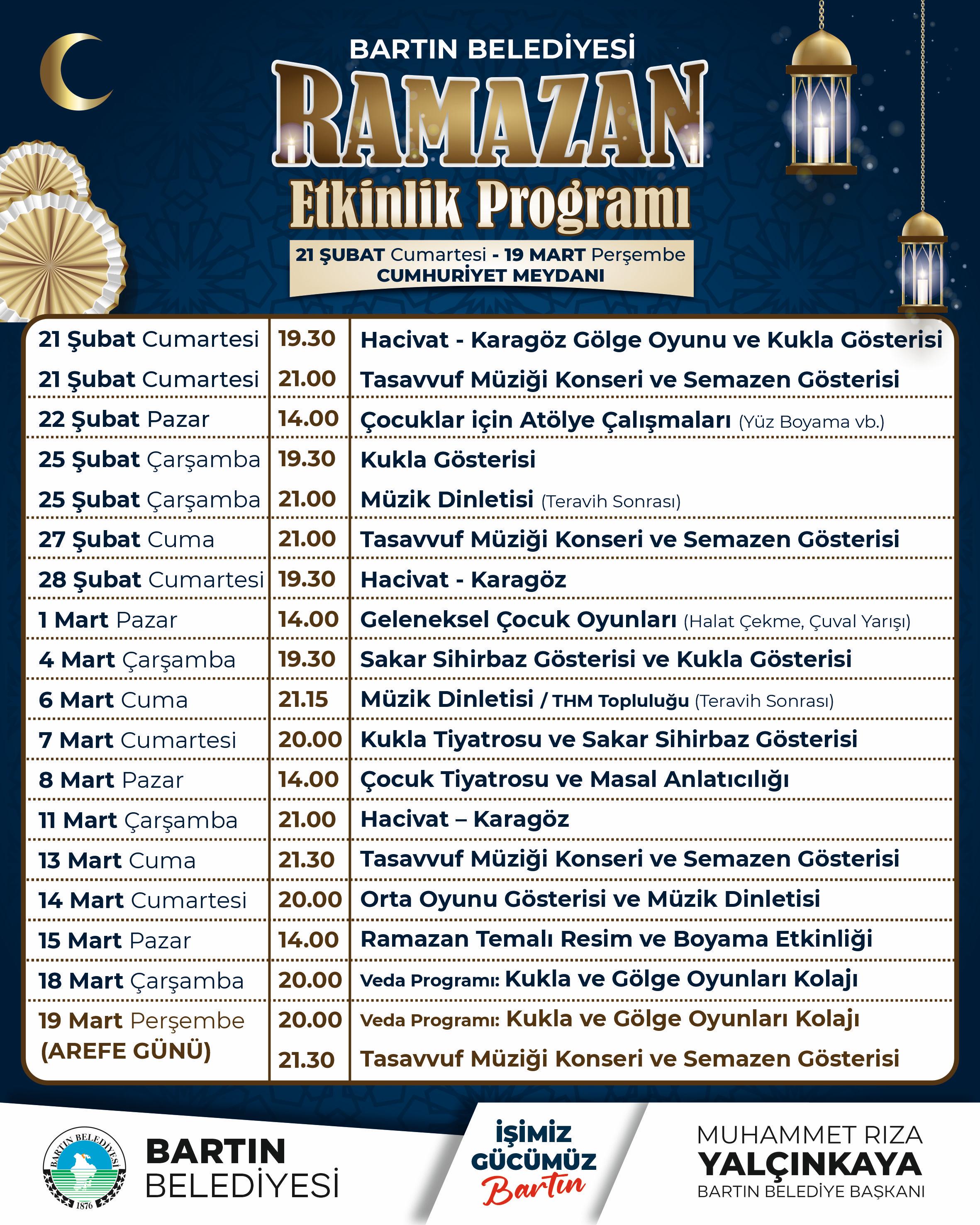 Bartın Belediye Başkanı Muhammet Rıza Yalçınkaya yaptığı açıklamada Ramazan ayının birlik, beraberlik ve dayanışma ruhuna dikkat çekerek, “Bu mübarek ayın ruhunu şehrimizde en güzel şekilde yaşatmak için birbirinden kıymetli etkinlikler hazırladık. Tüm hemşehrilerimizi Cumhuriyet Meydanı’nda kuracağımız Ramazan alanımıza davet ediyorum” ifadelerini kullandı.