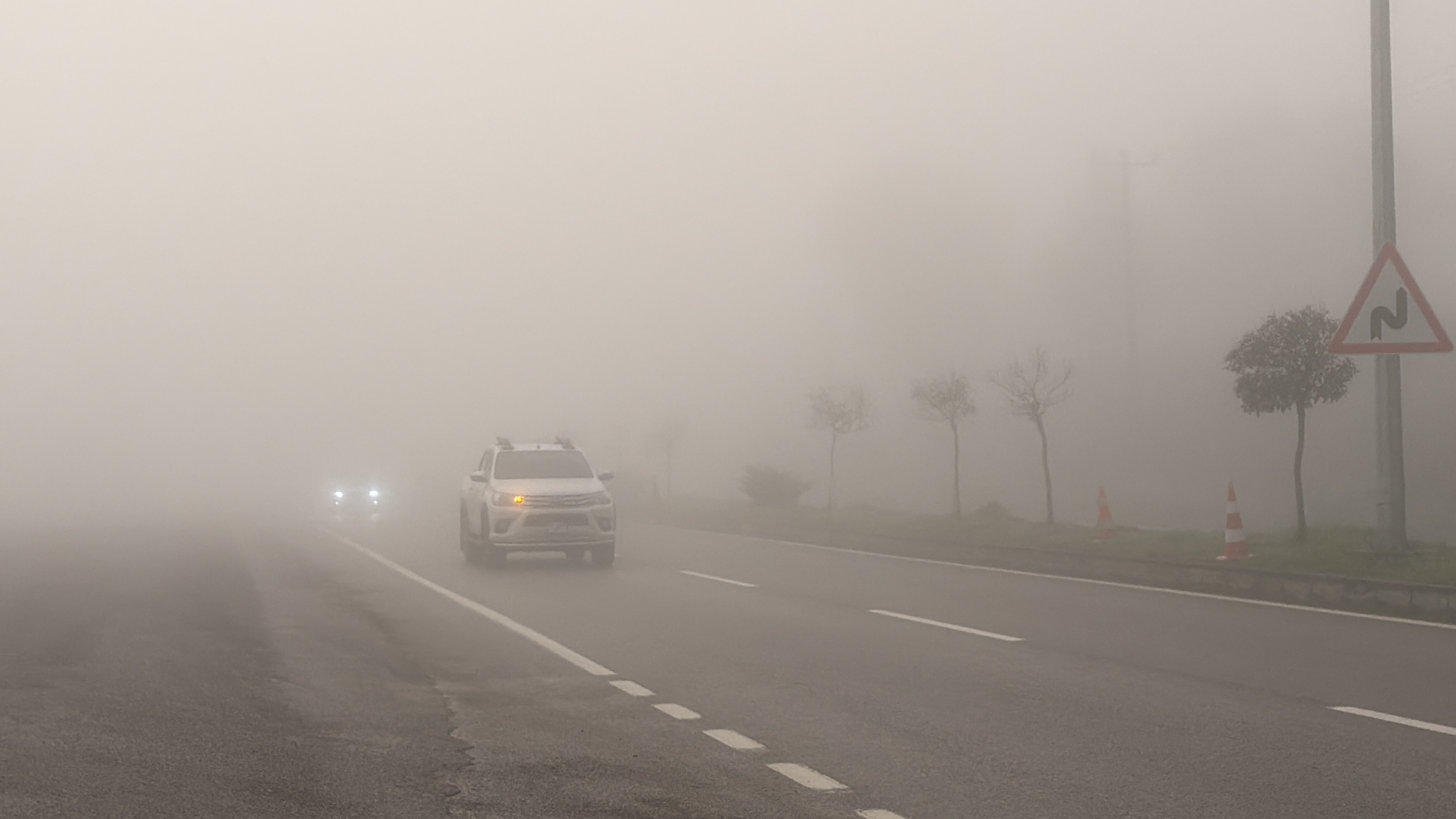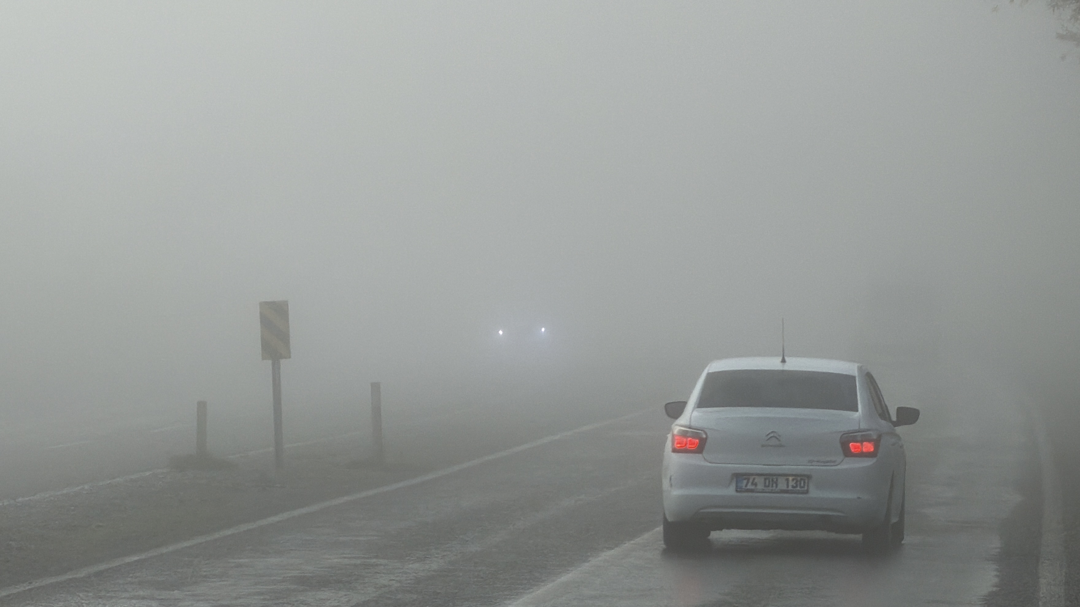 BARTIN'da sabah saatlerinde etkili olan sis nedeniyle görüş mesafesi yaklaşık 10 metreye düştü, trafikte sürücüler, araçlarıyla kontrollü ilerledi.