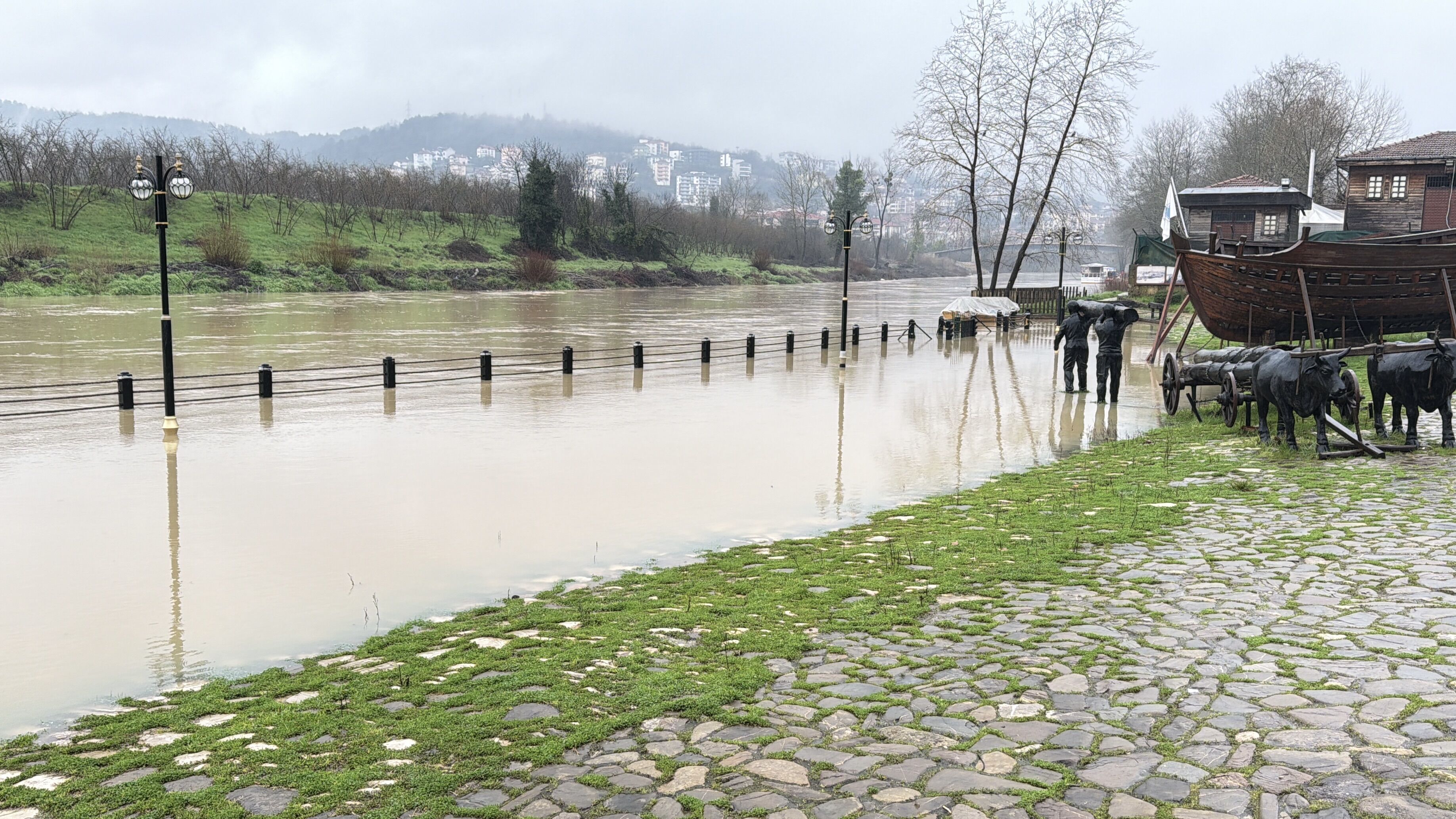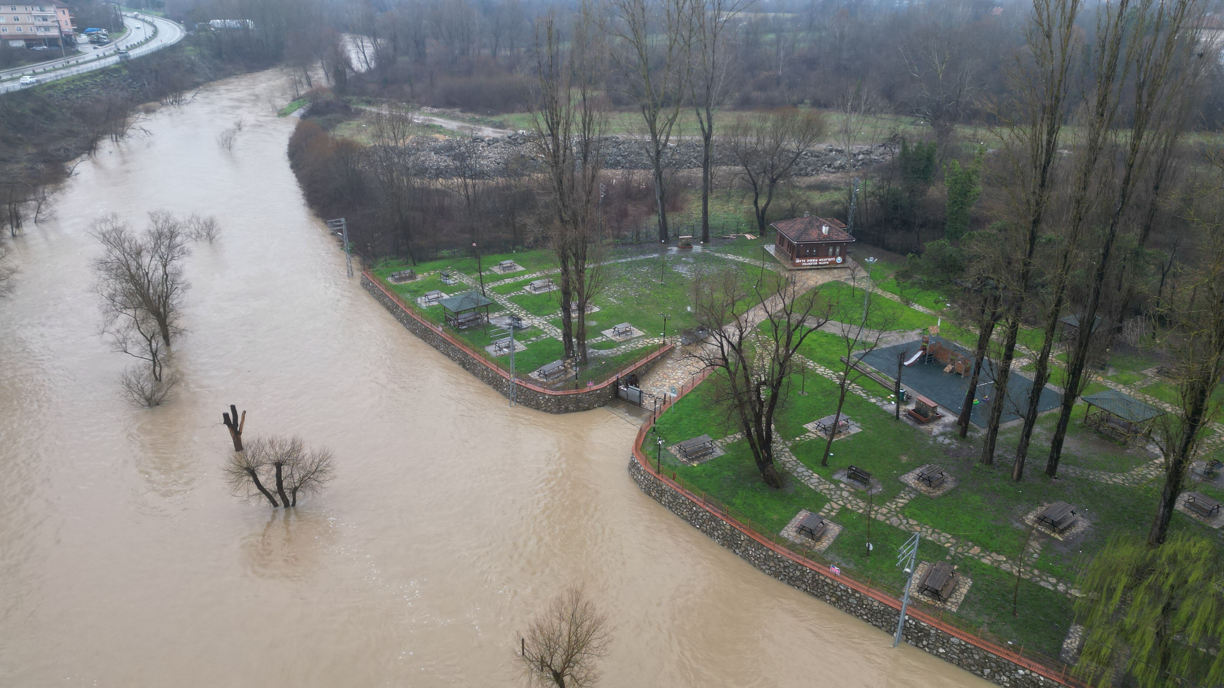 Bartın Irmağı'ndaki su seviyesi artışı, suyun taştığı piknik alanları ve yürüyüş yolları dronla görüntülendi.
