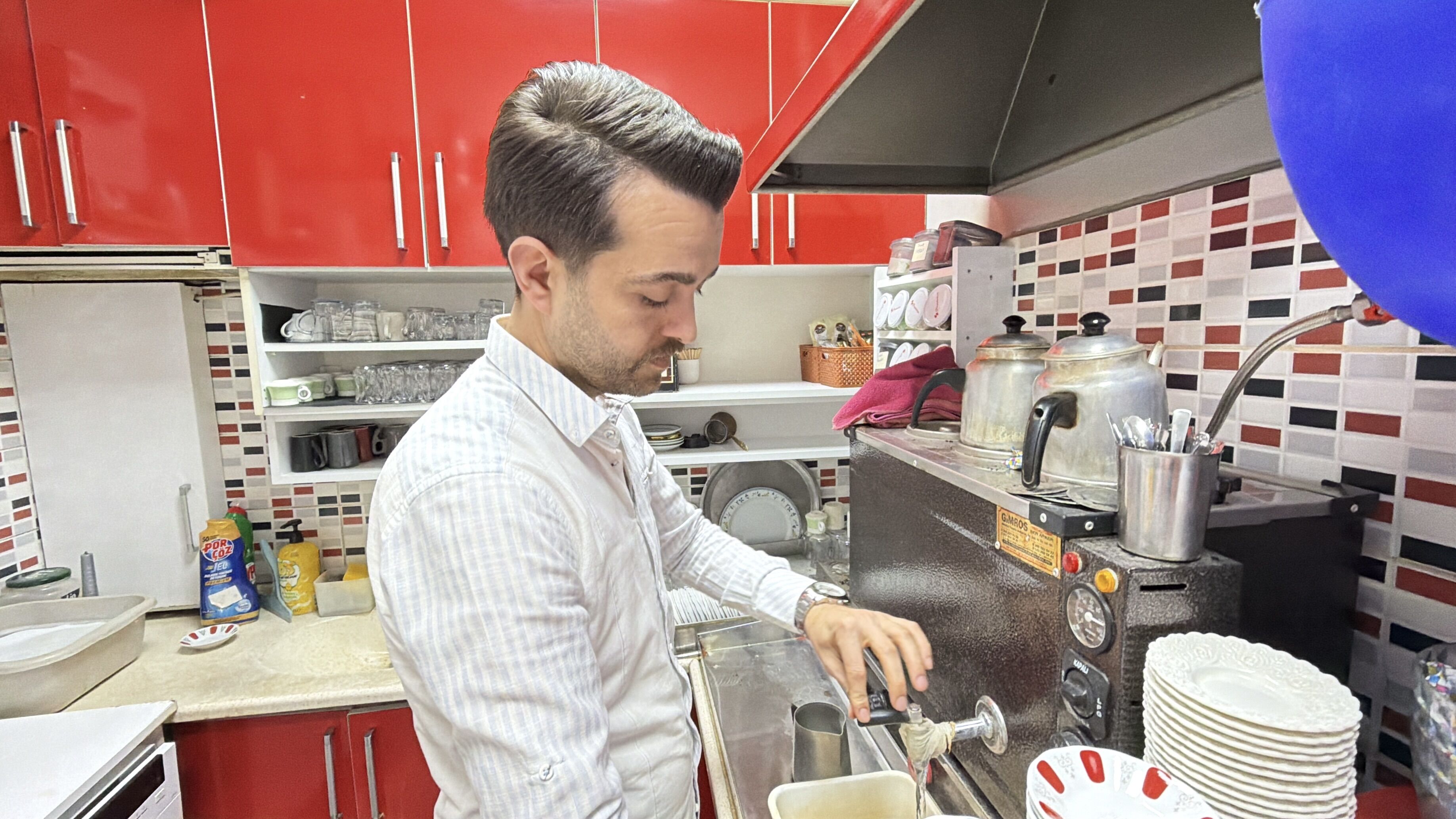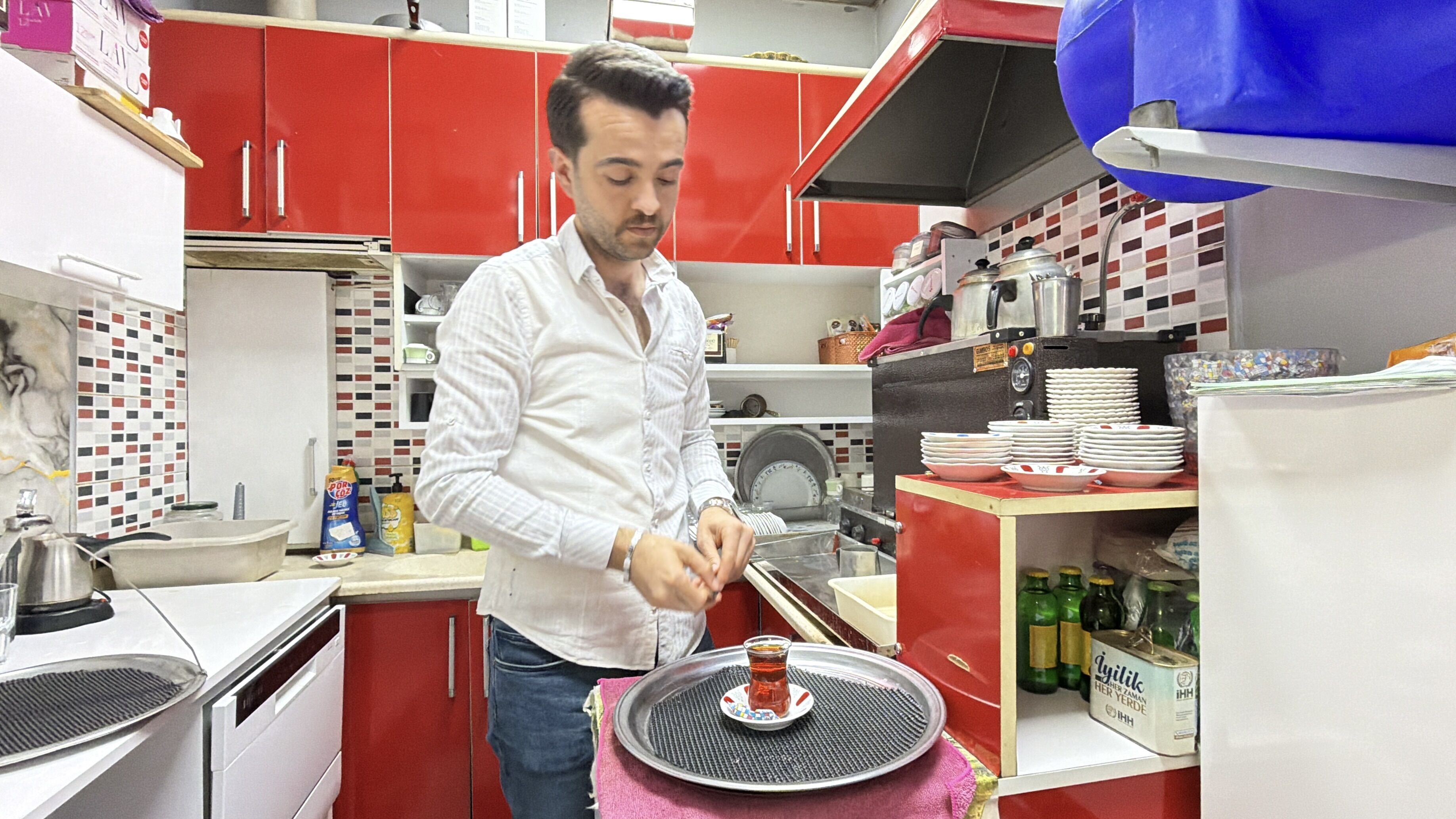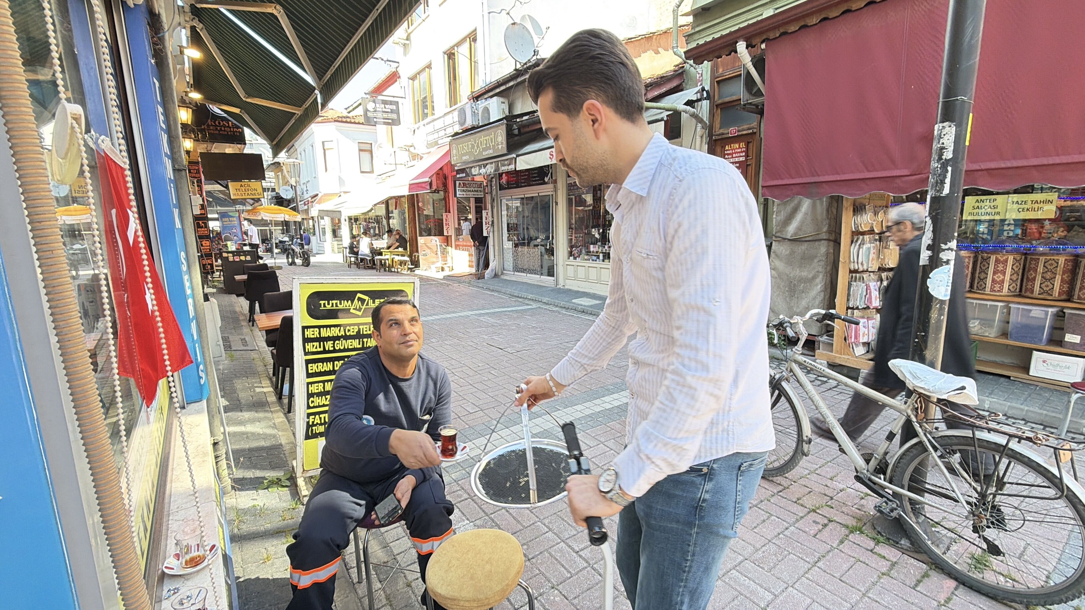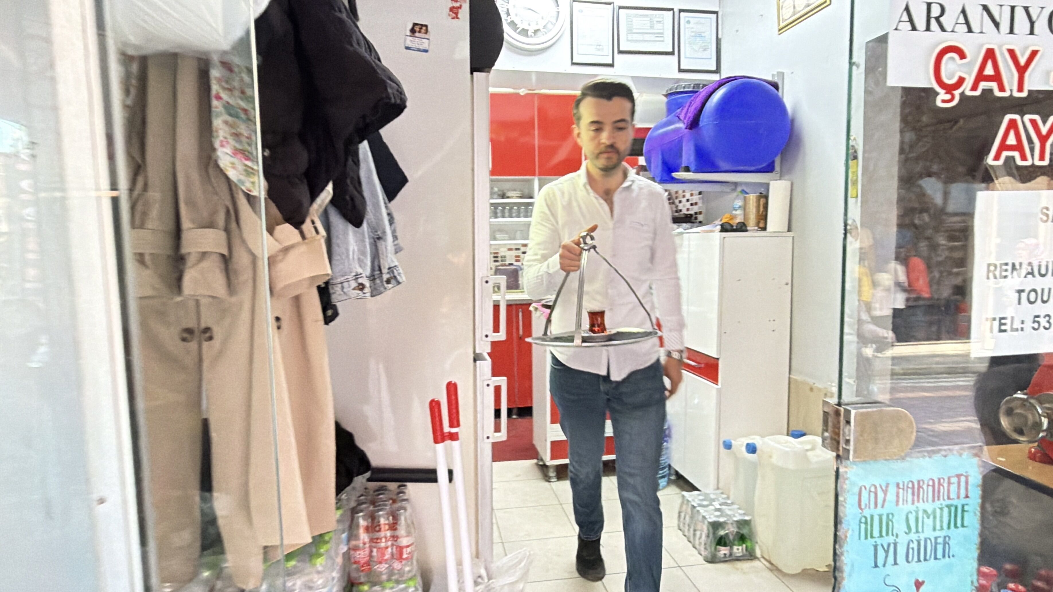 Her gün 25 binin üzerinde adım attığı için yorulan Basri Akbıyık, dükkanına uzak mesafedeki esnafın servisin geç gelmesi ve çayın soğuk olması gibi şikayetleri de eklenince farklı bir yönteme başvurdu.