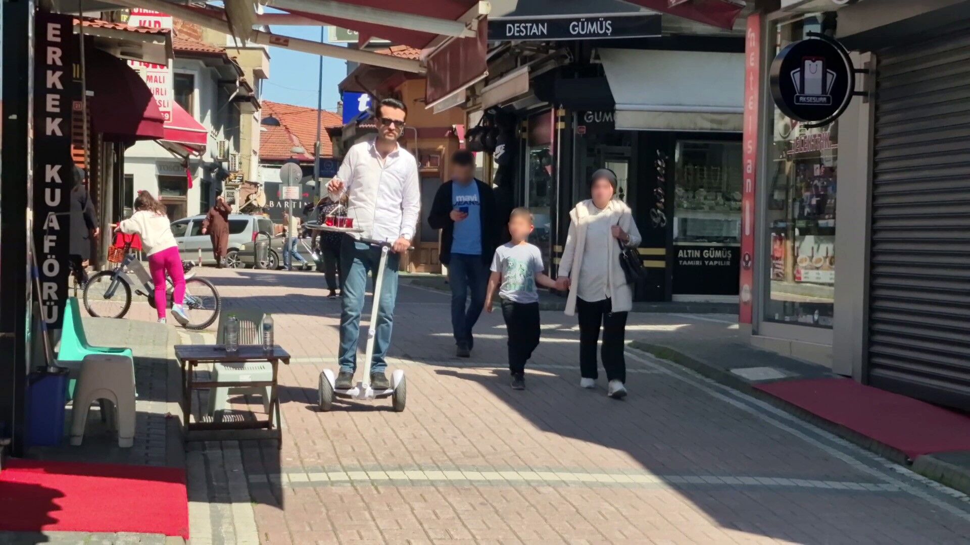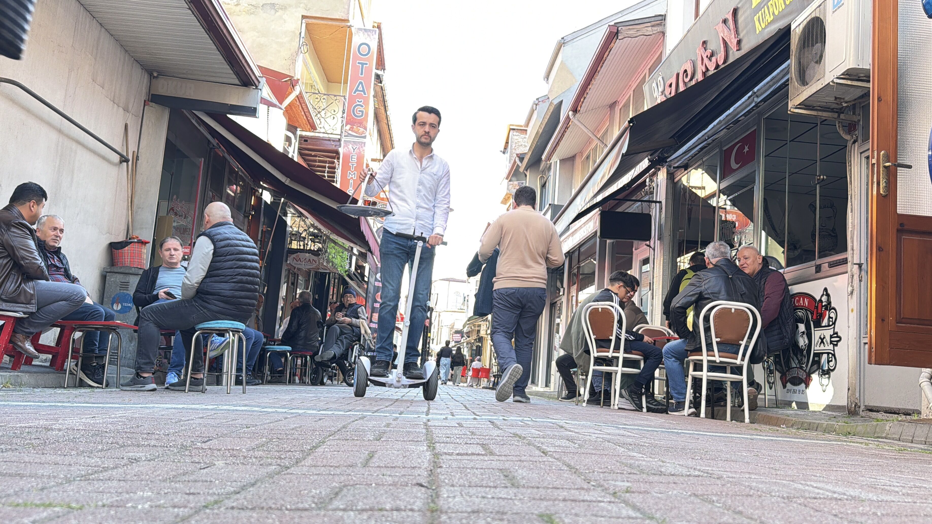 Bartın'da 1 yıl önce çay ocağı işletmeye başlayan Basri Akbıyık çay dağıtımına yetişemeyince cincır olarak bilinen elektrikli kaykay ile çay servisine çıkmaya başladı.