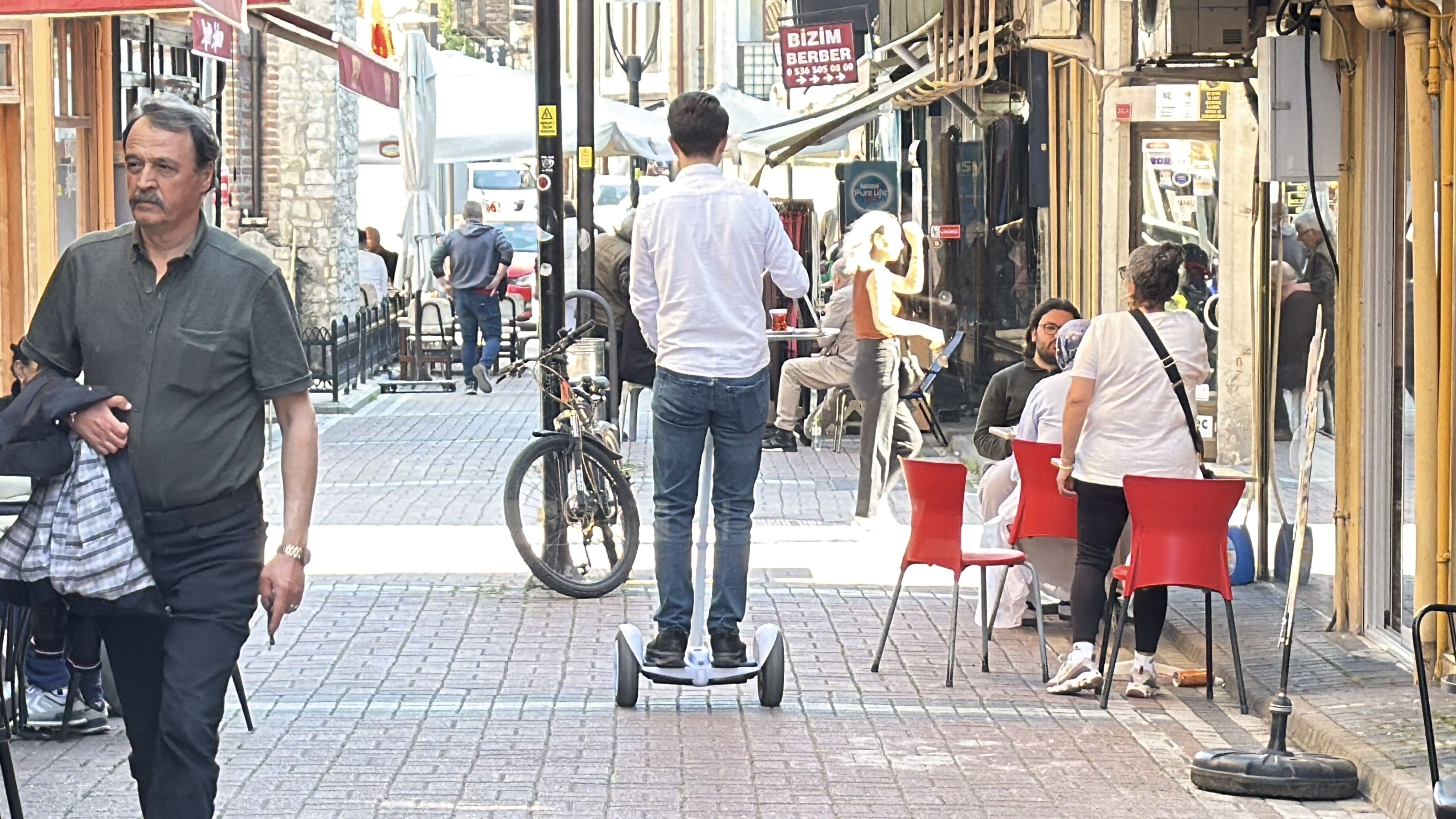 Yaklaşık 1 hafta önce ginger olarak bilinen elektrikli bir hoverboard alan Basri Akbıyık, çay servisini bu araçla yapmaya başladı.