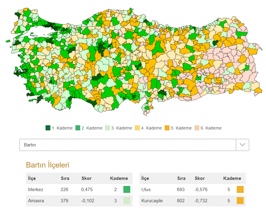 Sanayi ve Teknoloji Bakanlığı tarafından yayımlanan İllerin ve Bölgelerin Sosyo-Ekonomik Gelişmişlik Sıralaması Araştırması Bartın 5.kademeye düştü.