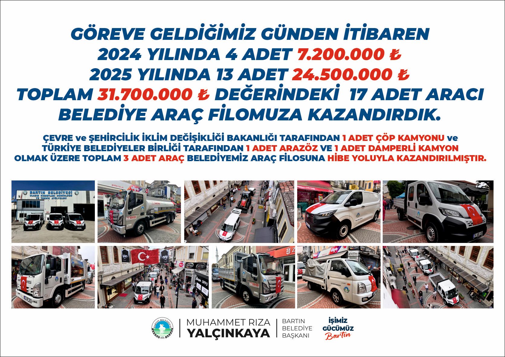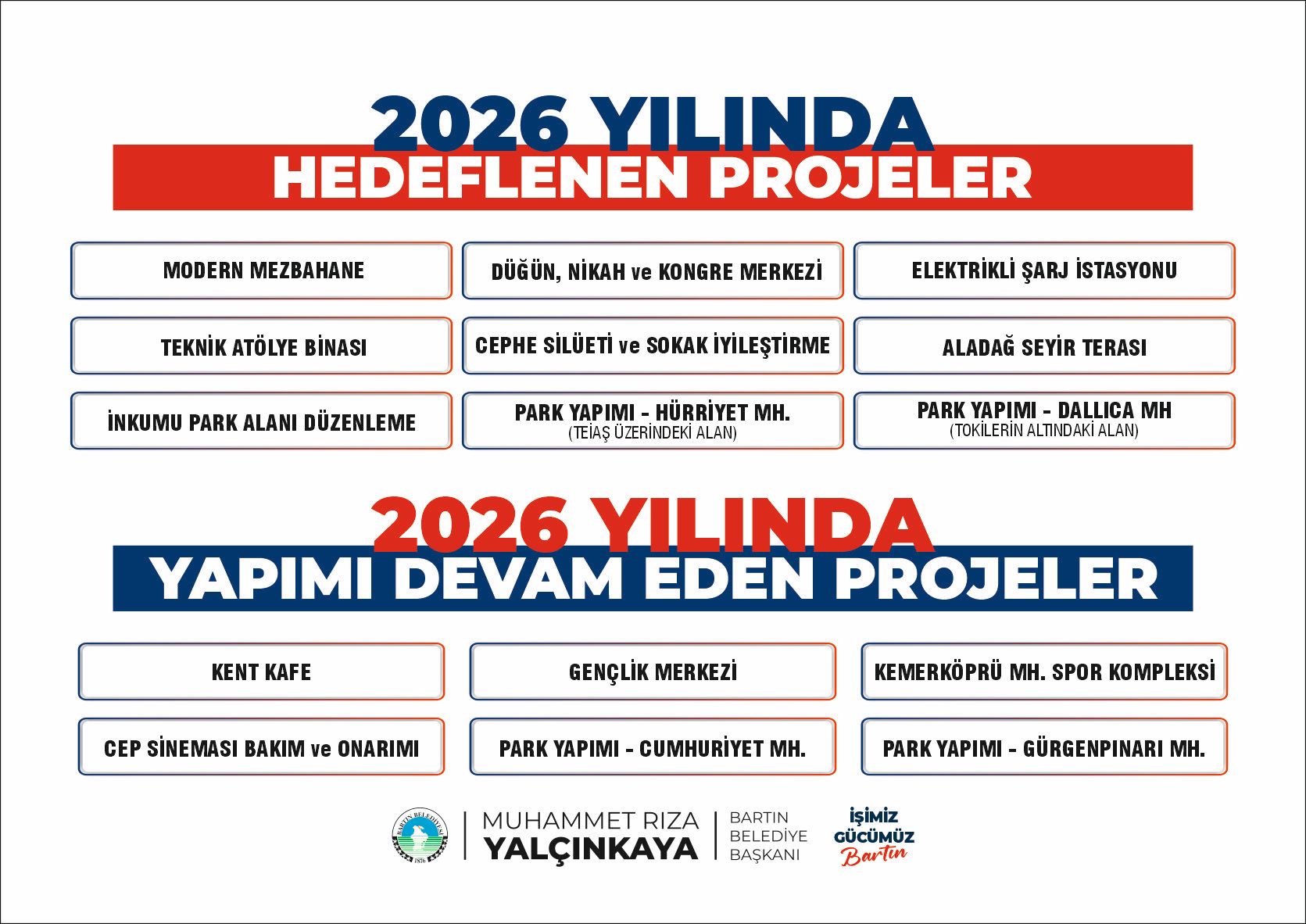 . Aynı zamanda 7 veya 8 yerde de sondaj çalışmalarımız yapılıyor. Bu sondaj çalışmalarımızın bir kısmı TOKİ bölgesinde, Dallıca bölgesinde, Hürriyet Mahallesi'nde bir su kesintisi sırasında nasıl besleyebileceğimize yönelik bir çalışma aynı şekilde Şiremirçavuş Mahallemiz ve yurtlar bölgesini besleyebileceğimiz bir çalışma olacak. Ve inşallah su konusunda 2026 yılında bitirmenin Bartın'da bir daha su sıkıntısının yaşanmadığını görmenin heyecanı içerisinde olacağız. Bunu da buradan müjdesini veriyorum. Aynı şekilde Bartın'da özellikle asfalt yolların tamir ve bakımını yapacağız. Orduyeri Mezarlığı'nın önünden gelip Kaynarca'ya kadar giden aynı zamanda yalıya inip yalıdan Gölbucağı Mahallemize giden içme suyu hatlarımızı değiştireceğiz hem de sıcak asfalt çalışmalarımızı yaparak Bartın'ın ihtiyacı olan yeni düzgün temiz asfalt yollara kavuşturmanın da mutluluğunu yaşayacağız. Değerli arkadaşlar göreve geldiğimiz günden bu güne kadar Bartın'ın ihtiyaçlarını meclis üyesi arkadaşlarımla, belediye çalışanlarımızla beraber hızlı bir şekilde üzerimize düşen görevi yerine getirmenin mutluluğu içerisindeyiz. Lütfen bizlere inanın. Bizlere güvenin. Gerçekten samimi olarak Bartın halkının beklediği bu güzel hizmetleri yapmanın mutluluğunu yaşamak istiyoruz. Biraz elimizi çabuk tutarak bir an önce bu hizmetleri Bartın halkına ulaştırmak sevdası içerisindeyiz. Bunları nasıl yapıyorsunuz diye belki düşünce içerisinde de olabilirsiniz ama oluyor. Eksi 280 milyondan devraldığımız belediyeyi bugünlere nasıl getirdiğimizi hep beraber görüyorsunuz. Göreve geldiğim vakit eksi 280 milyon lira bir parayla teslim aldığımız belediye şu anda borçsuz bir belediye durumuna geldi. Şu anda yatırımcı bir belediye durumuna geldi ve durmadan işimiz gücümüz Bartın diyerek tam gaz bu hizmetleri yapmaya devam ediyoruz. Demek ki yapılabiliyormuş. Demek ki eğer gelirine, giderine sahip çıkabilirsen bu işler çok rahat yapılabiliyormuş. Allah'a şükür kimseye borcumuz yok. Hiçbir şekilde cari borçlarımız yok. İhale yapımın da ihalesi biten müteahhit borcumuz yok. Esnafımıza borcumuz yok. Her şeyi açık ve şeffaf bir şekilde de yapıyoruz. Bütün amacımız, arzumuz bu beş yıl içerisinde Bartın halkının bize güvenerek emanet ettiği bu şehre layık olduğu hizmeti yapabilmek. Başka hiçbir amacımız yok. Bartın halkı güvendi, inandı ve bu şehri bize emanet etti. Biz de bu emanete hıyanetlik etmeden bu Bartın halkının beklediği hizmetleri yerine getirmenin mutluluğu içerisinde olmak istiyoruz. Her zaman söylediğim bir şey var. Bu fani dünyadan bir gün öbür dünyaya göç edeceğiz. Ama göç ettiğimizde arkamızdan iyi konuşulsun istiyorum. Hoş bir seda bırakmak istiyorum. Arkadaşlarımla beraber bu görevi bunun için layıkıyla yapıyoruz ve o dediğim gün Allah hepimize uzun ömür versin ama kaçınılmaz sona geldiğimizde de arkamızdan iyi konuşulsun. Bak bir belediye başkanı vardı. Rıza Yalçınkaya bunları beş sene içerisinde bitirdi. Bir örnek alalım. Bir hoş edayla anılalım istiyorum. Ben beni dinlediğiniz için teşekkür ediyorum. Ve bir kez daha bana bu fırsatı veren otuz bir mart seçimlerinde bize güvenip, inanıp destek veren sevgili kadirşinas hemşerilerime teşekkürlerimi sunuyorum. Onların desteği, onların katkısı ve yaptığımız bu hizmetlerden sonra Allah razı olsun demeleri bize güç katıyor. İnşallah bu dualarla ayakta durduğumuz müddetçe bize verdikleri güç anlamındaki destek ve katkılarıyla biz de inşallah onların başlarını öne eğmeden bizimde onlara karşı başımız öne eğilmeden, başımız dik, alnımız açık, bu hizmetleri yapmaya devam edeceğiz” dedi.
