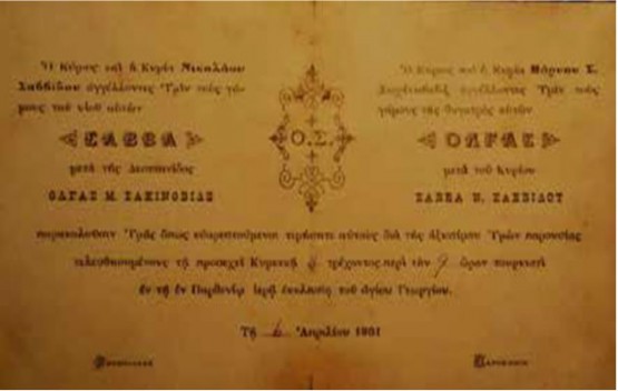 1901 yılına ait bir Rumca düğün davetiyesi (Bartın’da yaşayan Saharinovias ve Savidot ailelerinin evlatlarının düğünü)