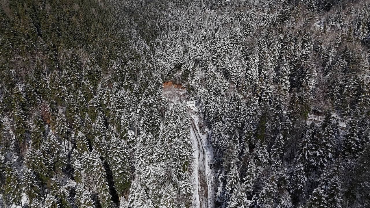 Bartın - Karabük kara yolunda etkili olan kar yağışı sonrası oluşan beyaz örtü dronla görüntülendi.