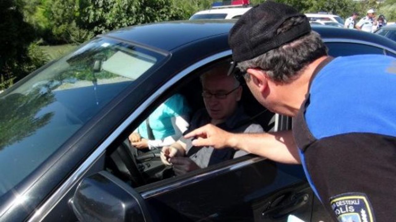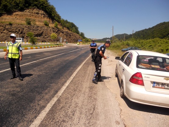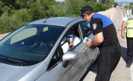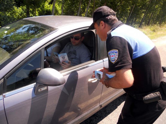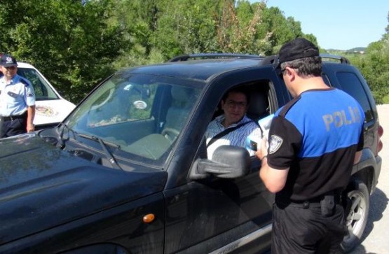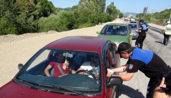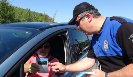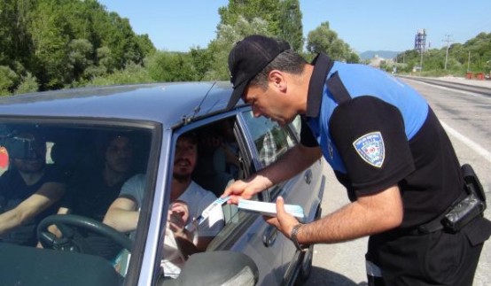 BARTIN'A TATIL ICIN GELEN SURUCULERI DURDURAN POLISLER, KARADENIZ SAHILLERINDE GORULEN CEKEN AKINTI ILE ILGILI HAZIRLATILAN BROSURLERI DAGITTI. FOTO-AYHAN ACAR-BARTIN-DHA