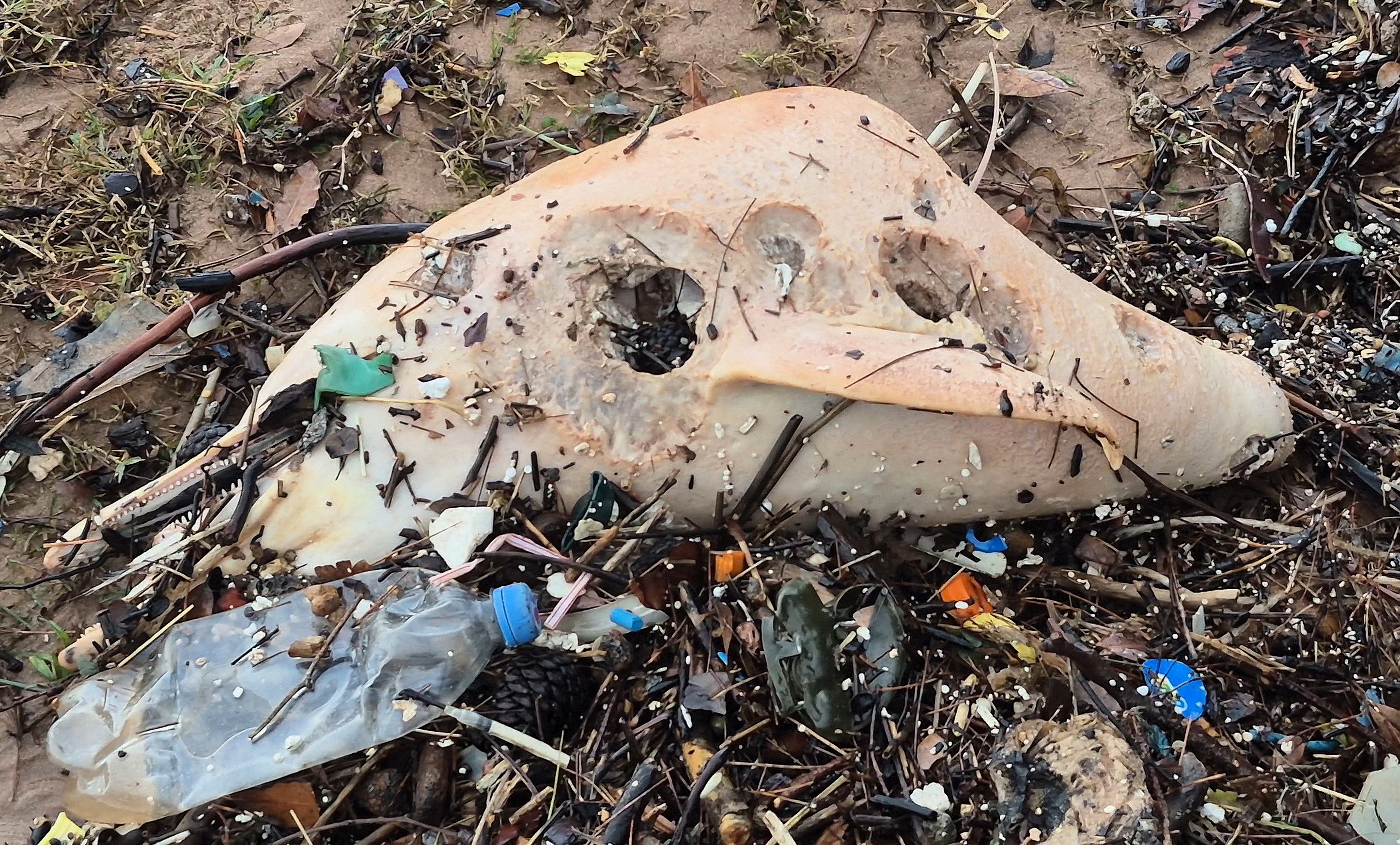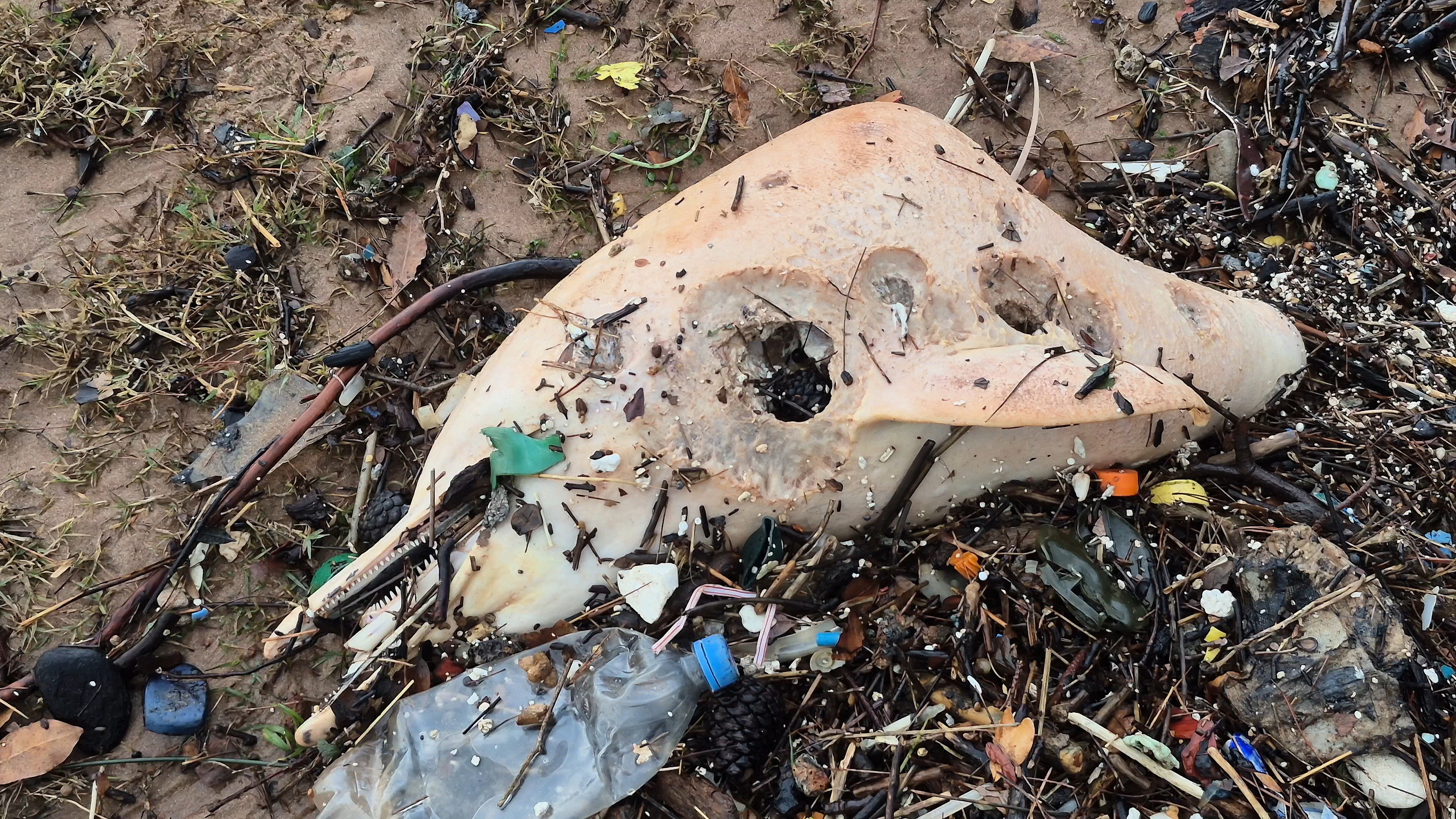 Bartın'ın Amasra ilçesine bağlı Bozköy Sahili'nde dev dalgalar ölü bir yunus balığının kalıntılarını karaya sürükledi. Yunus balığının sahile vuran kısmında, dişleri ve çenesinin bulunduğu kafatası ile üzerindeki yağ tabası yer aldı.