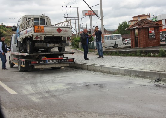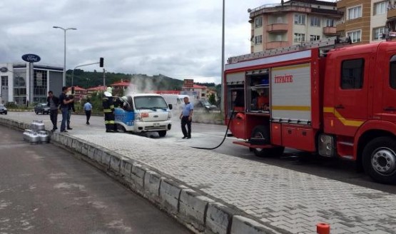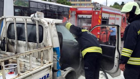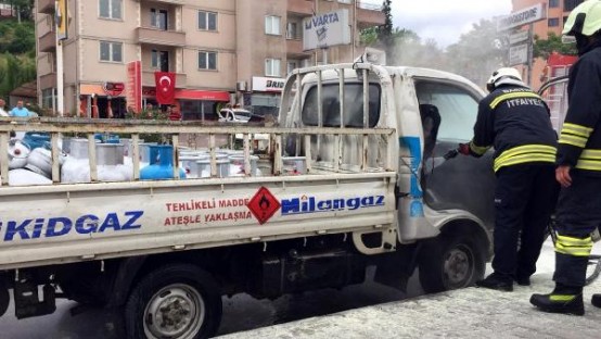 BARTIN’DA TÜP DOLU KAMYONETTEKİ YANGIN KORKULU ANLAR YAŞATTI. (AKİF YAMAN/BARTIN-İHA)