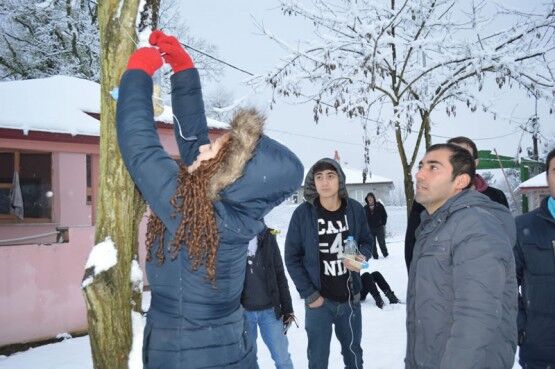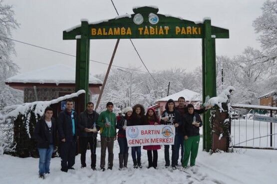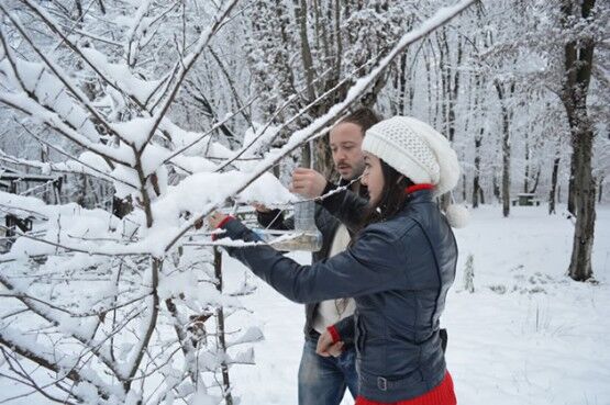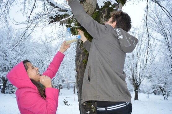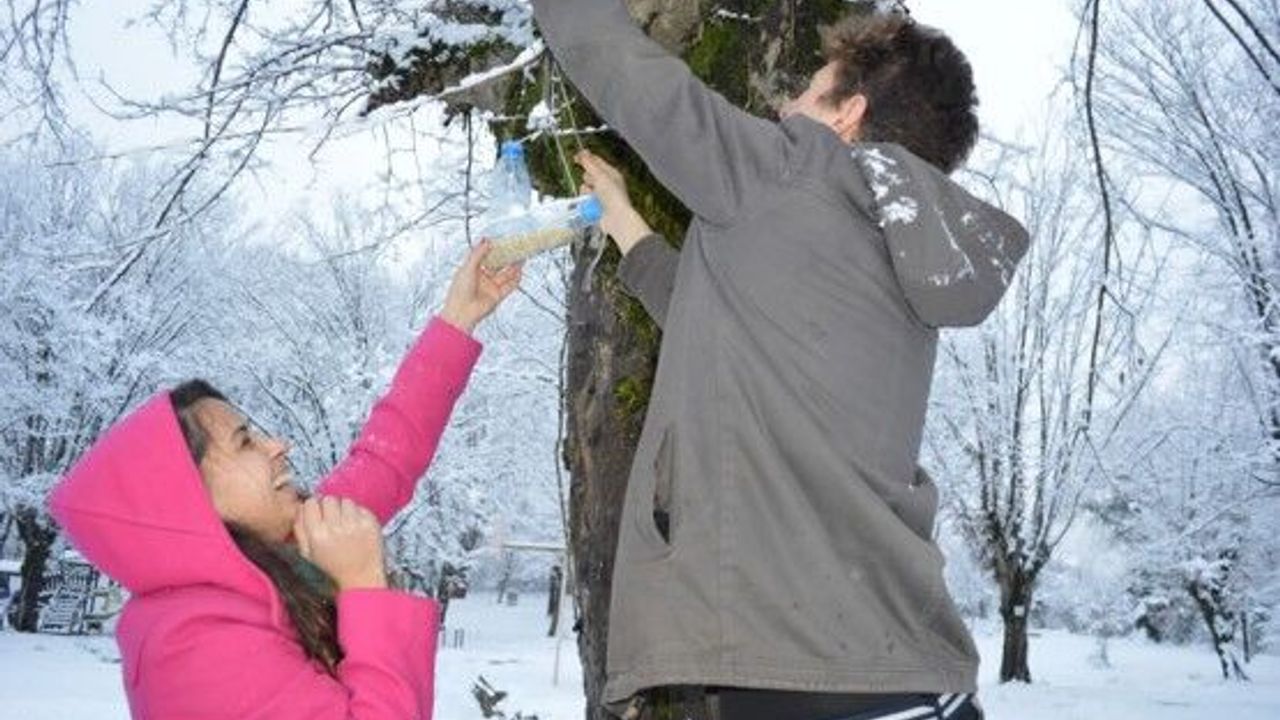 KENTTE YOĞUN KAR YAĞIŞI NEDENİYLE, BARTIN GENÇLİK MERKEZİ TARAFINDAN DOĞADA YİYECEK BULMAKTA ZORLANAN KUŞLAR İÇİN PET ŞİŞELERDEN YEMLİK YAPILARAK, AĞAÇLARA ASILDI. (SERKAN ARAT/BARTIN-İHA)