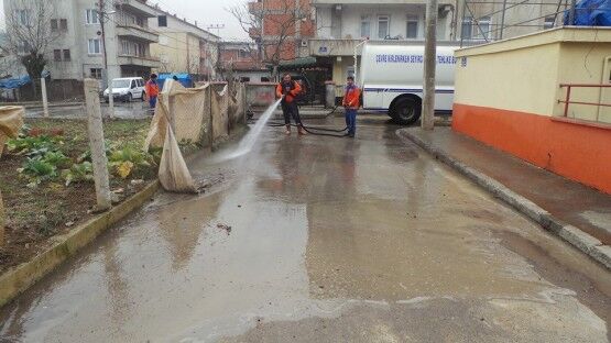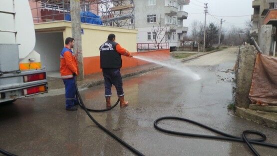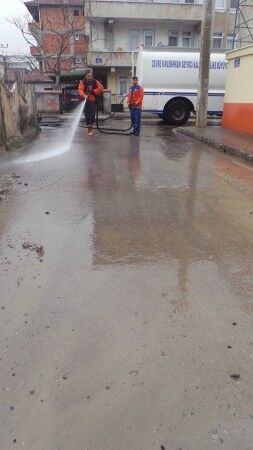 Bartın Belediyesi mahallerin yol ve kaldırımlarını tazyikli su ile temizliyor. Ekipler temizlik çalışmalarına Çayırlar mevkiinde devam ediyor.