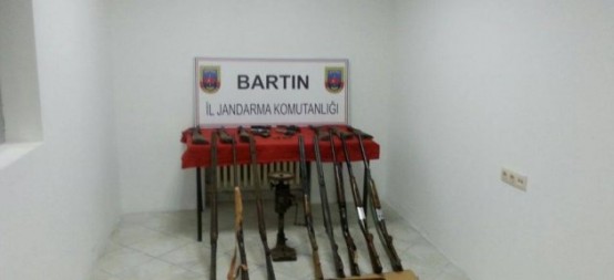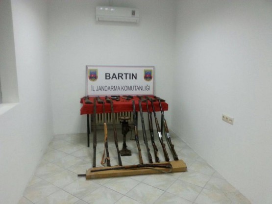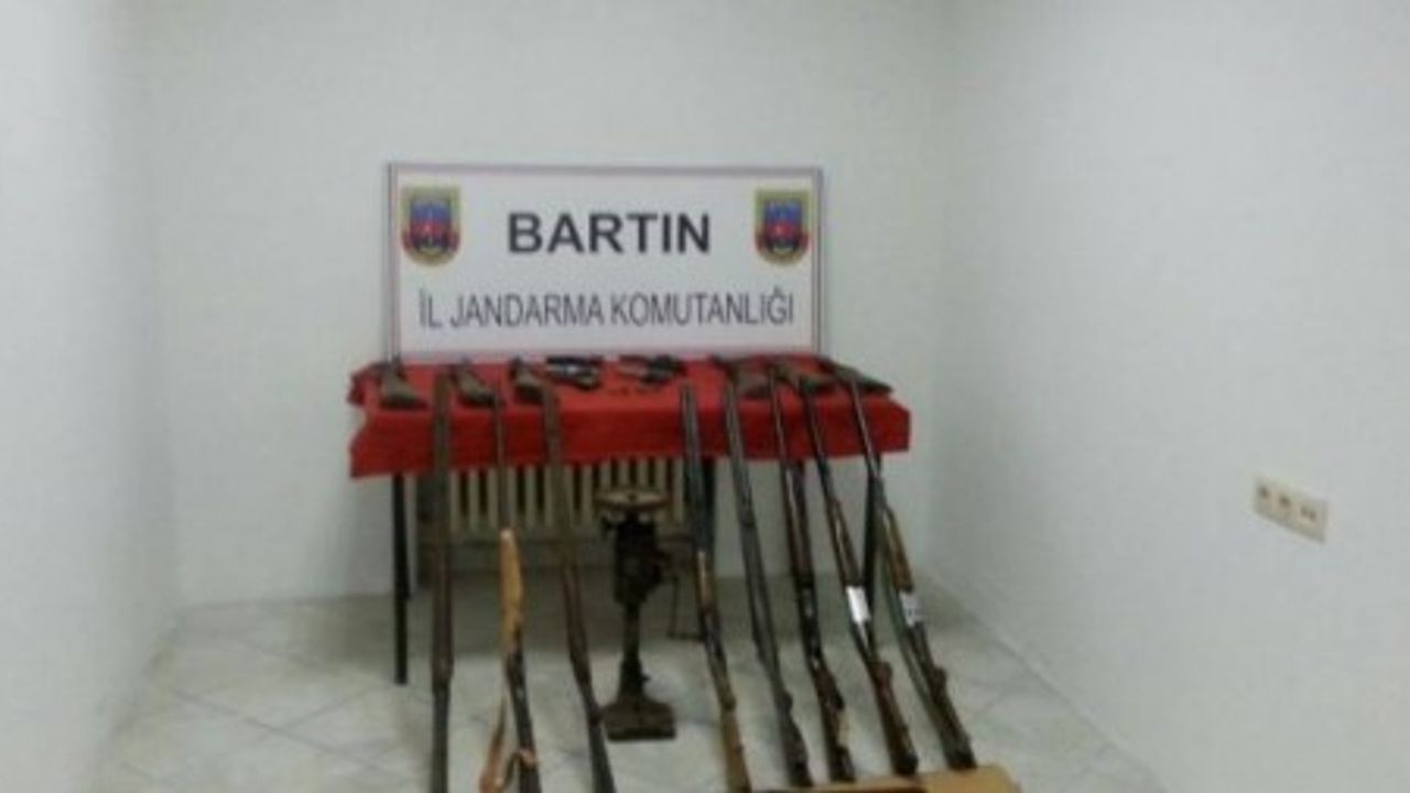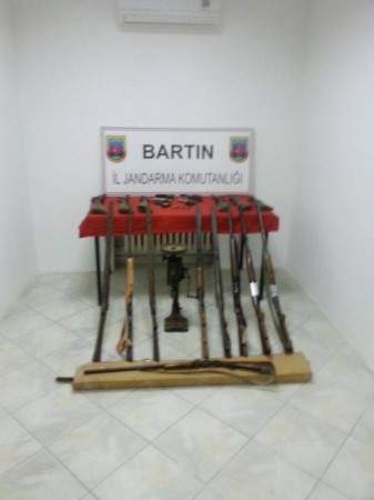 Bartın İl Jandarma Komutanlığı Kaçakçılık ve Organize Suçlarla Mücadele Kısım Amirliği ekiplerinin operasyon yaptığı bir evde çok sayıda silah, tüfek ve kuru sıkı tabancanın normal silaha dönüştürülmesini sağlayan malzemeler bulundu. / İHA