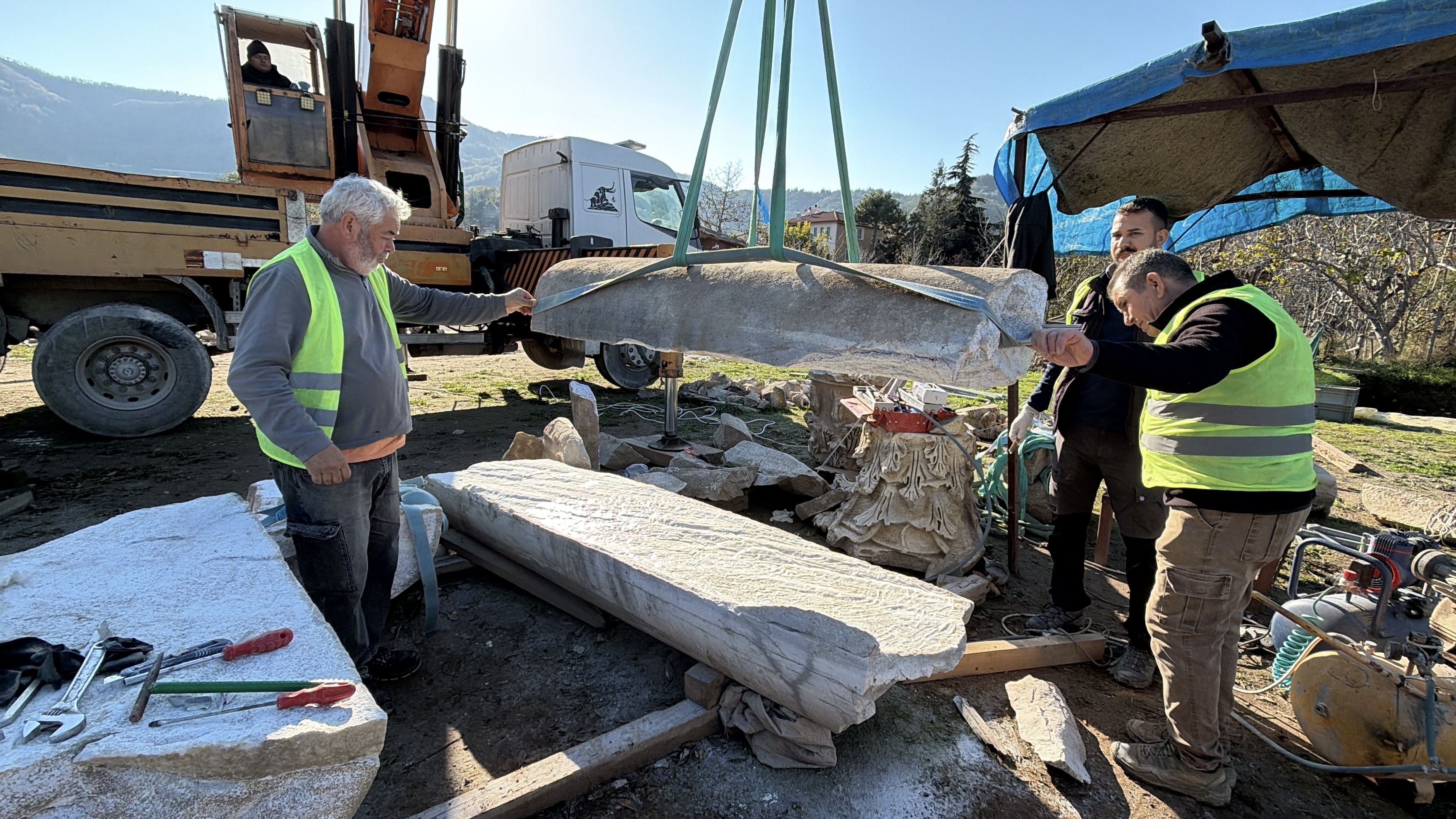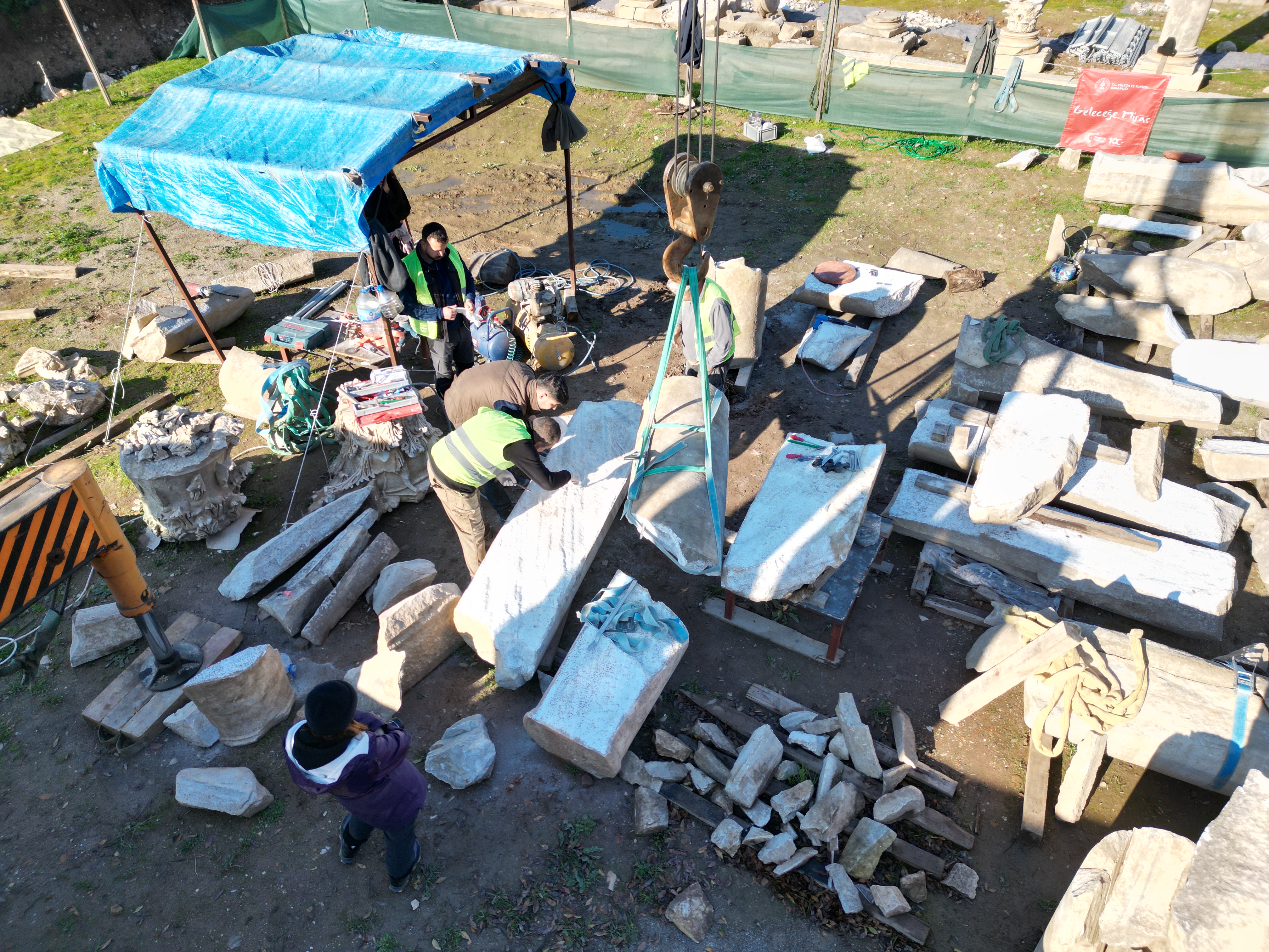 2024 yılında 3 sütunu ayağa kalkan yapının, son 1 yılda kayıp sütun parçaları tespit edilerek aslına uygun şekilde birleştiriliyor.
