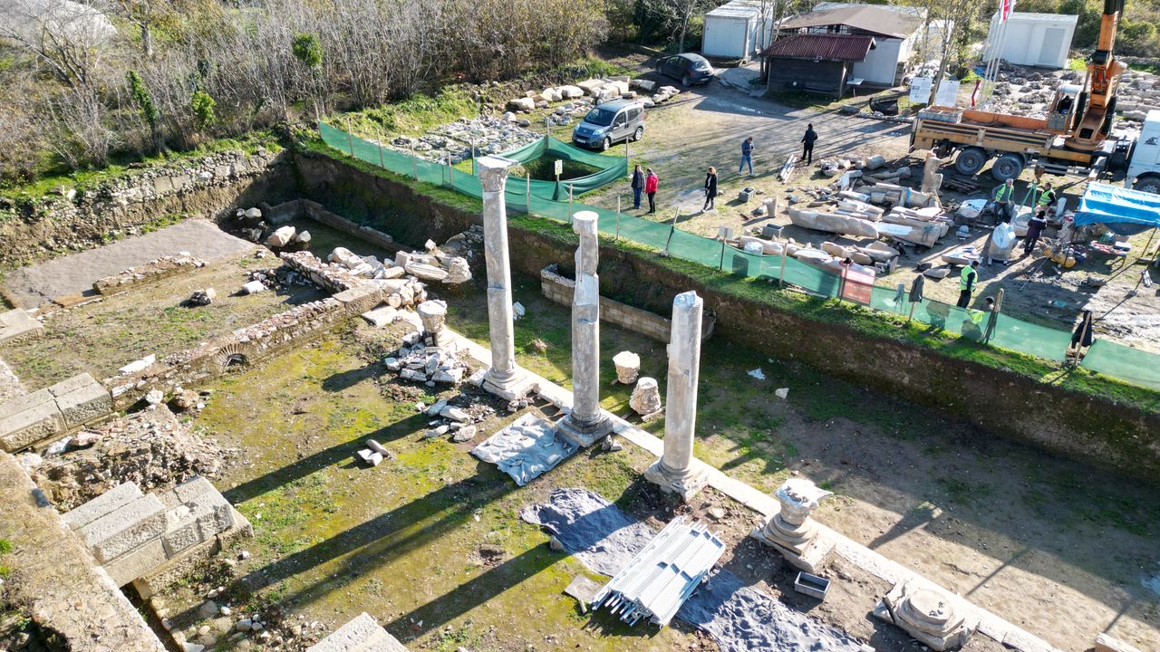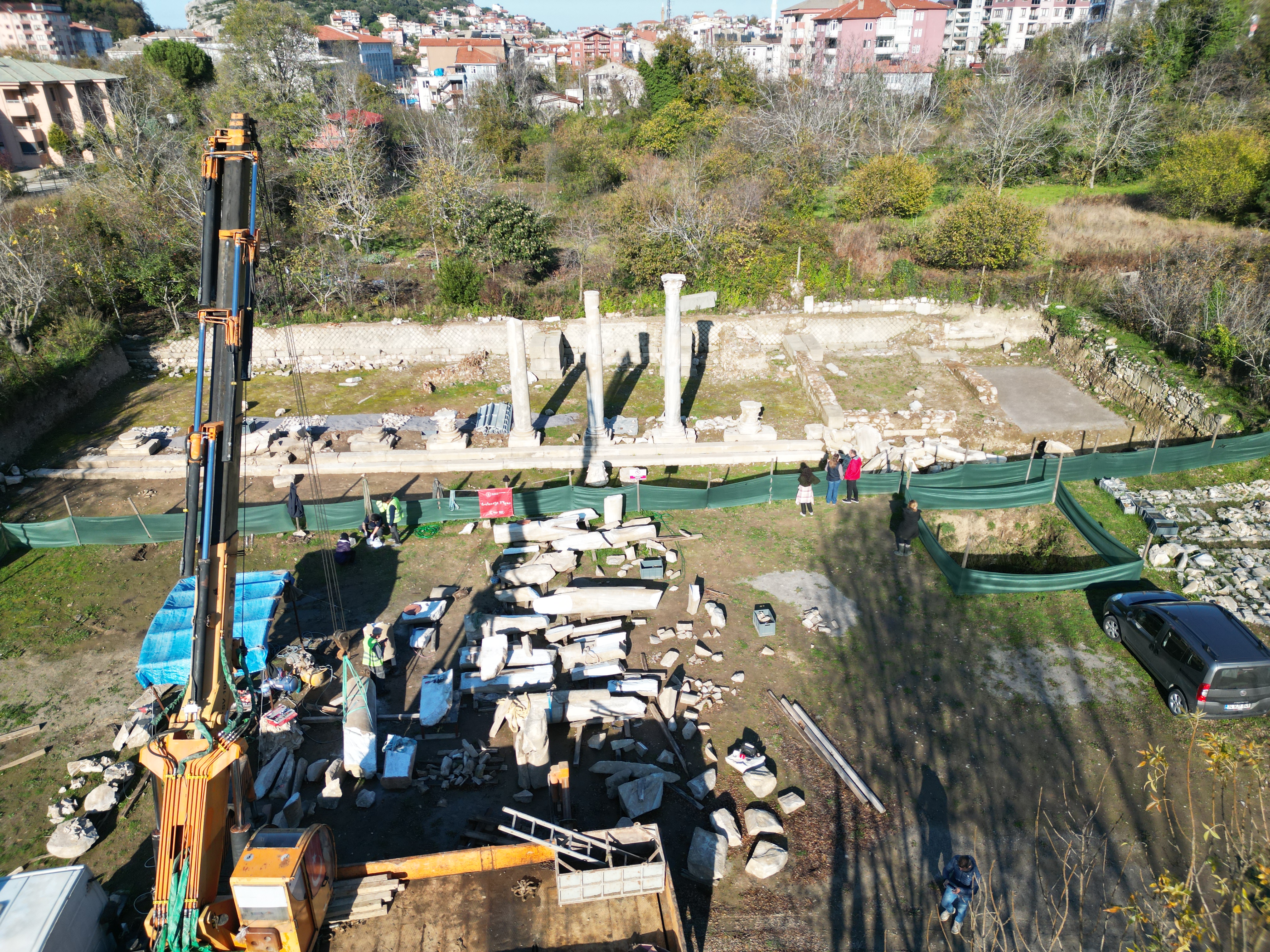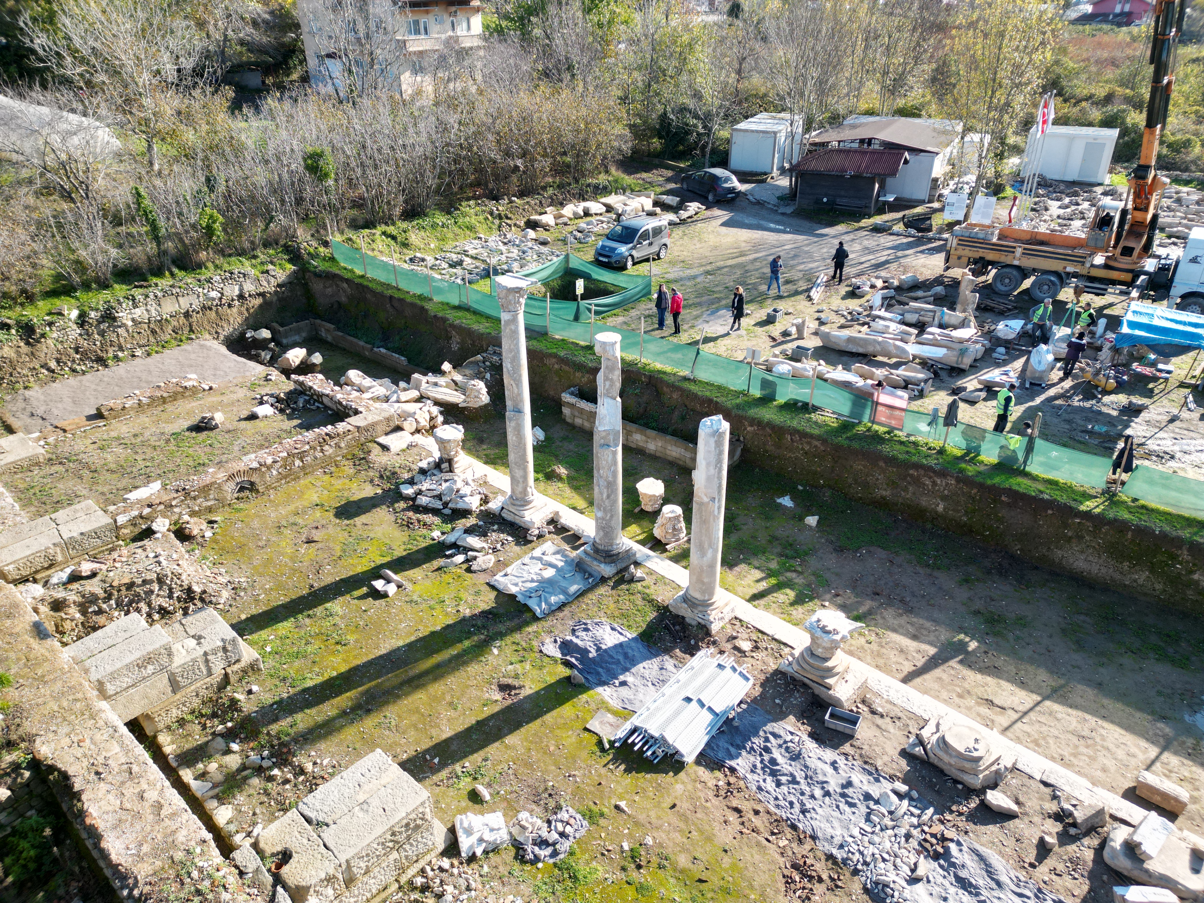 Alanda bulunan mermer sütun parçaları ise iş makineleri yardımıyla aslına uygun şekilde bir araya getirilerek alana yeniden yerleştiriliyor. Bu yıl sonuna kadar Roma dönemine ait 7 sütunun birleştirilmesi ve üst yapı bloklarının yerleştirilme çalışmalarının tamamlanması hedefleniyor. Alanın 2026 yılı içerisinde ören yeri ilan edildikten sonra ziyarete açılması planlanıyor.