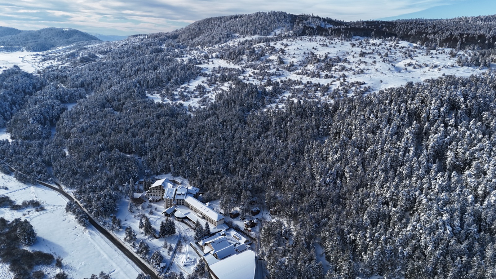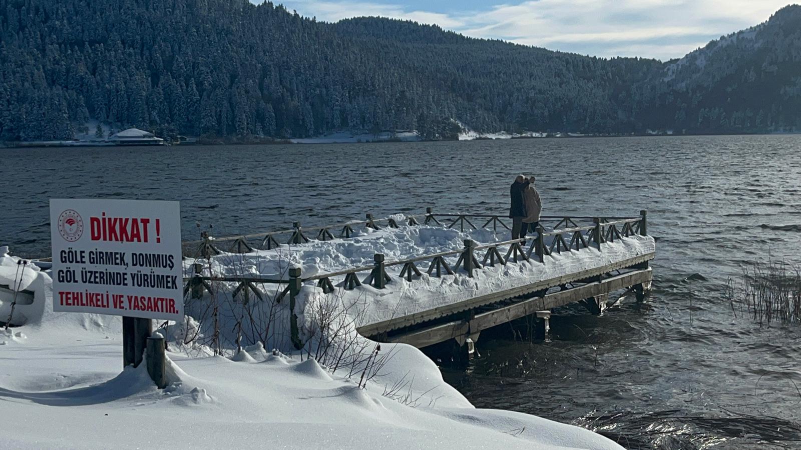 Tatil için Abant’a gelenler, soğuk havaya rağmen göl çevresinde yürüyüş yapıp manzaranın tadını çıkardı. Beyaz örtüye bürünen Abant Gölü Milli Parkı'nın eşsiz manzarası dron ile görüntülendi.