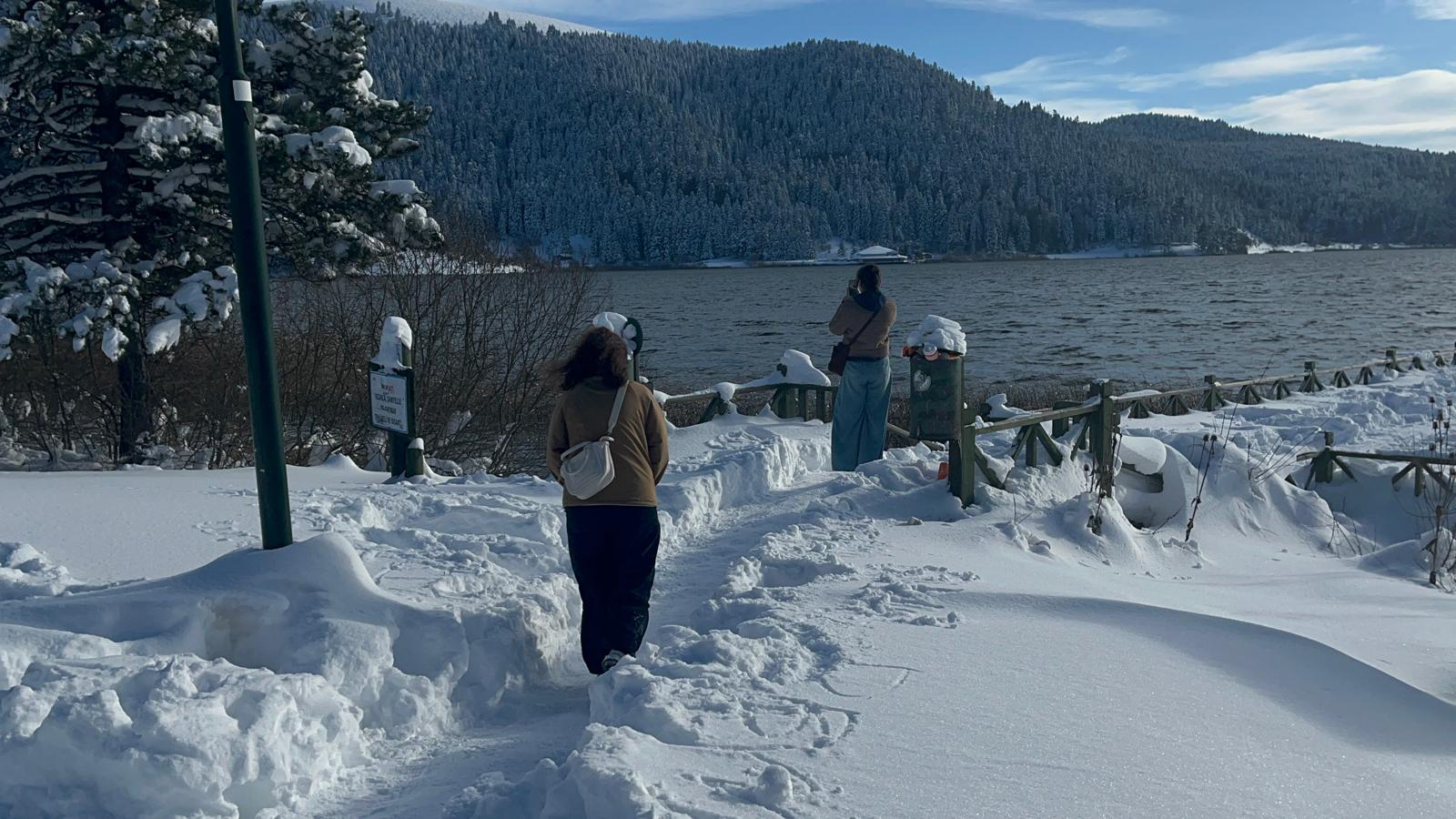 Tatil için Abant’a gelenler, soğuk havaya rağmen göl çevresinde yürüyüş yapıp manzaranın tadını çıkardı.