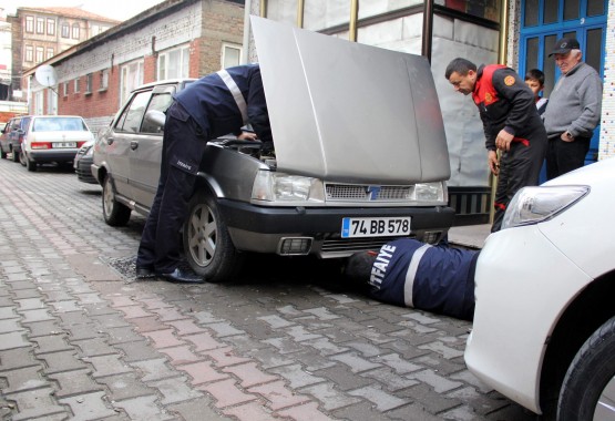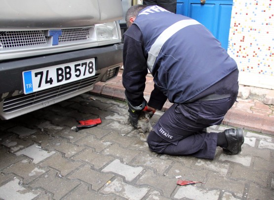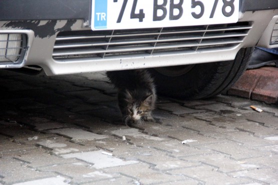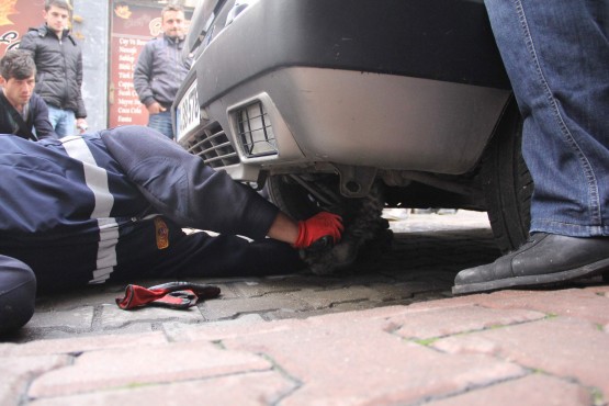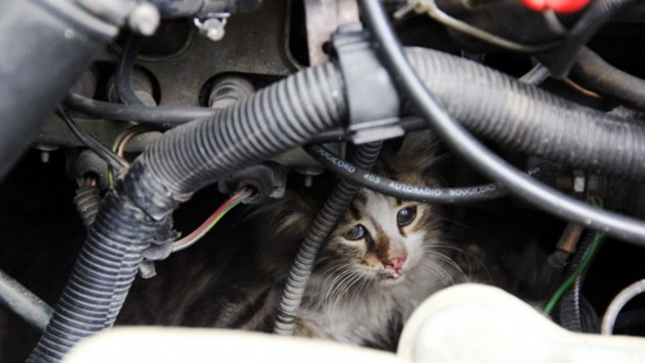 BARTIN’DA, ISINMAK İÇİN PARK HALİNDEKİ BİR OTOMOBİLİN MOTOR BÖLÜMÜNE GİREN VE BURADA SIKIŞAN YAVRU KEDİ, İTFAİYE TARAFINDAN KURTARILDI. (HALİL TEKİN - SERKAN ARAT/BARTIN-İHA)