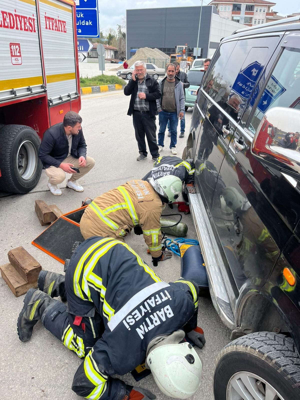 Bartın'da kavşakta kendisine çarpan aracın altında sıkışan kadın, ekiplerin uzun uğraşları sonucu yaralı olarak kurtarıldı.