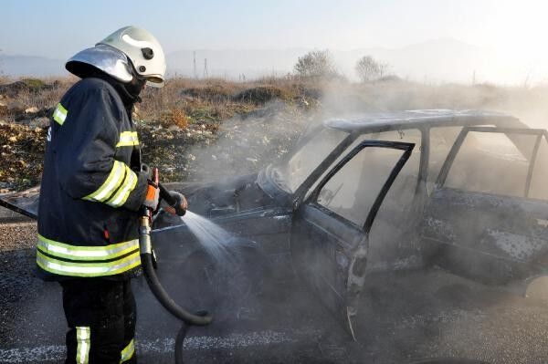 ITFAIYE, SEYIR HALINDEYKEN ALEV ALAN OTOMOBILDEKI YANGINI SONDURDU. ANCAK ARAC BUYUK ORANDA YANARAK KULLANILMAZ HALE GELDI. FOTO-AYHAN ACAR-BARTIN-DHA
