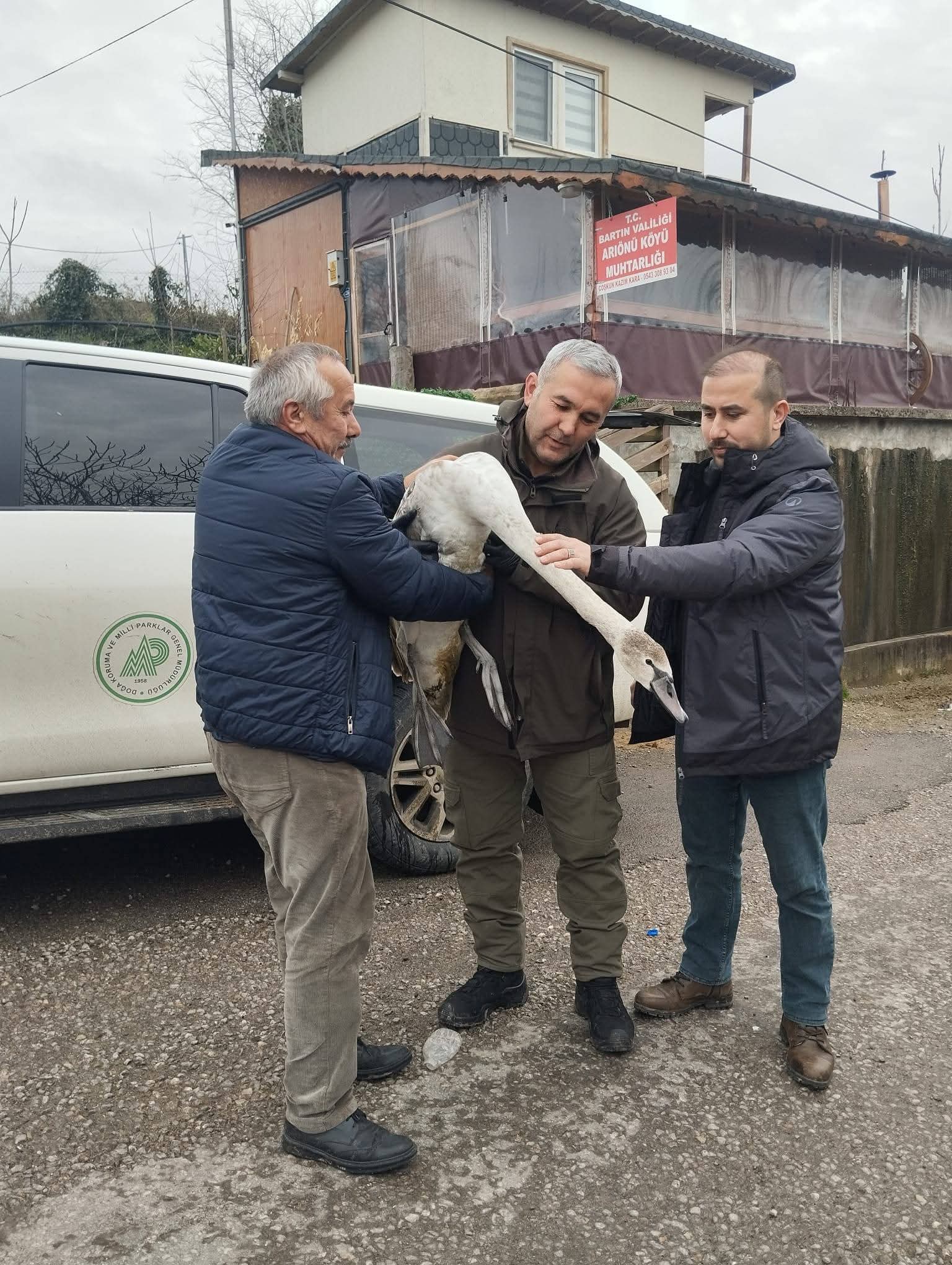 Kuğuyu ekiplere teslim eden muhtar, sosyal medya hesabı üzerinden paylaşımda bulunarak, "Arıönü köyü Mugada Sahili'nde yakalamış olduğumuz kuğumuzu Doğa Koruma ve Milli Parklar Müdürlüğümüze teslim ettik, emeği geçen herkese teşekkür ederim artık emin ellerde inşallah" ifadelerini kullandı.