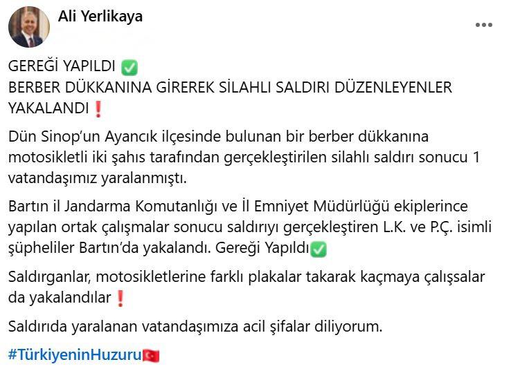 Şüpheliler L.K. ve P.Ç.'nin motosikletlerine farklı plakalar takarak kaçmaya çalıştıkları belirlendi. Bartın İl Jandarma Komutanlığı ve İl Emniyet Müdürlüğü ekipleri tarafından yapılan ortak çalışma ile 2 şüpheli Bartın'da yakalandı. İçişleri Bakanı Ali Yerlikaya da olayla alakalı sosyal medya hesabından paylaşımda bulundu.