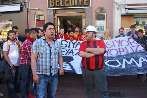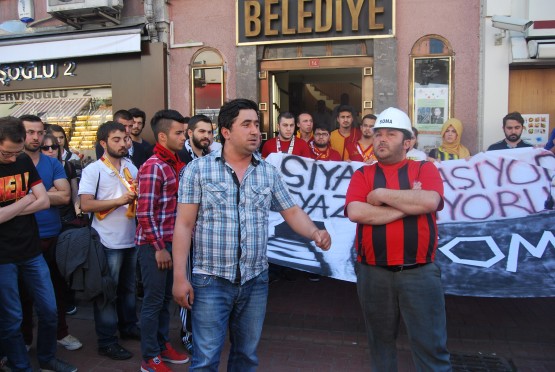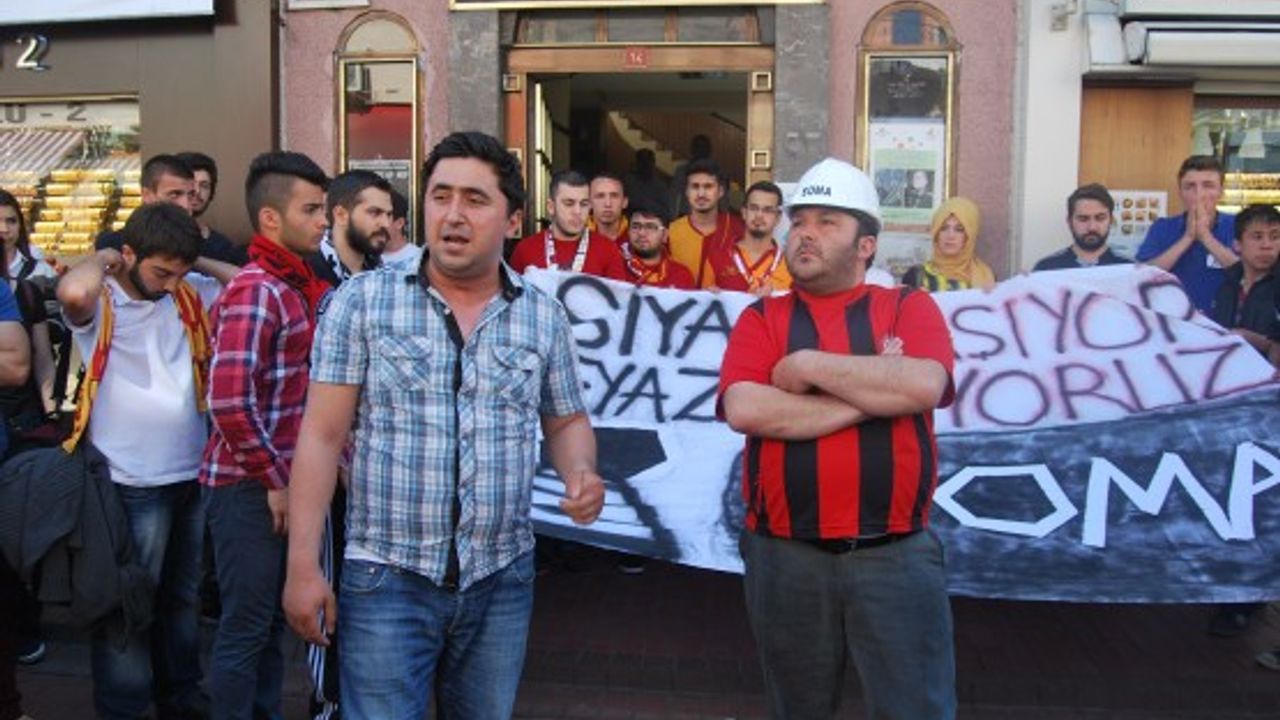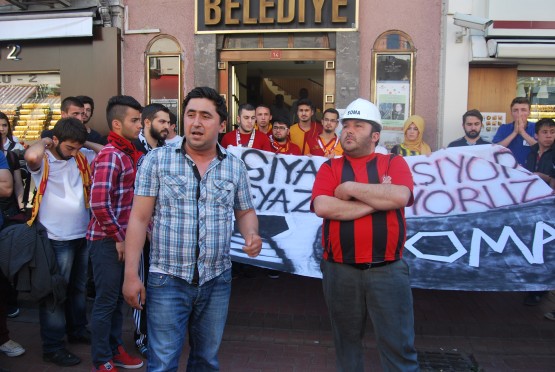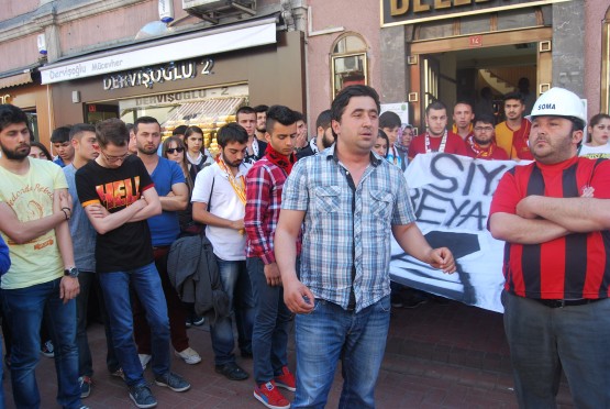 Siyahı Yaşıyoruz Beyazı Arıyoruz” yazılı pankartla ana caddede slogan atan taraftar grupları, eski belediye önünde anma programı düzenledi. Burada ölen maden işçileri için saygı duruşunda bulunuldu. Foto: Muhammet Bayraktar