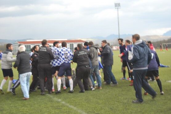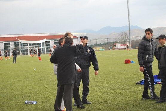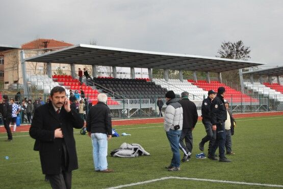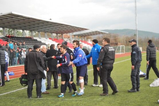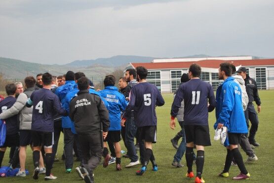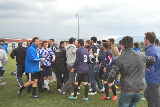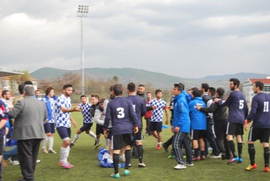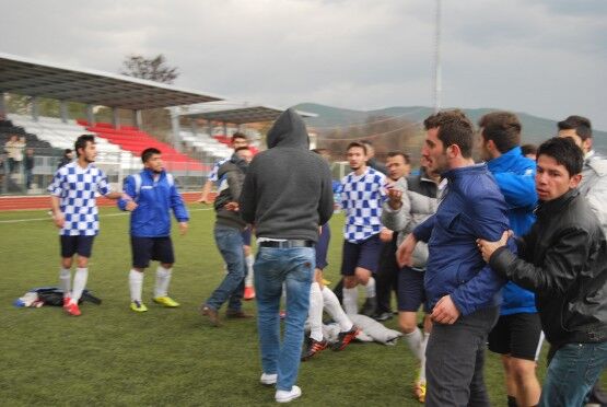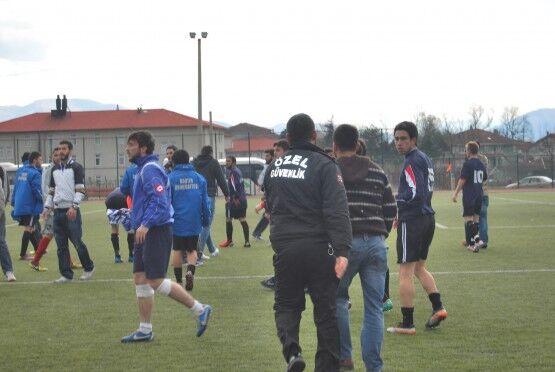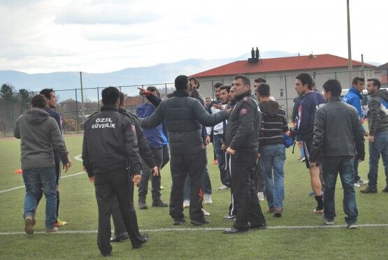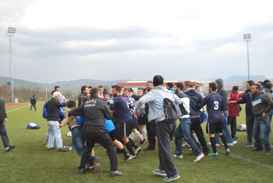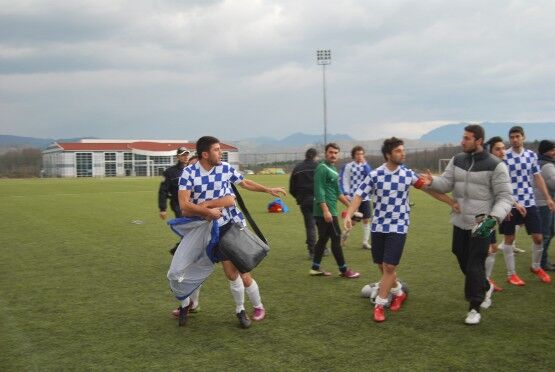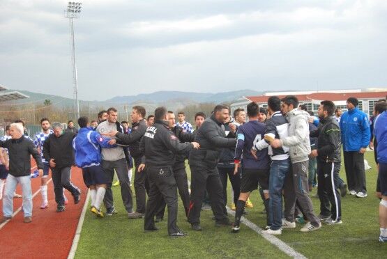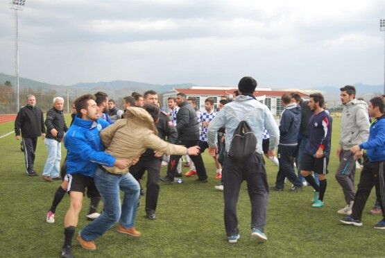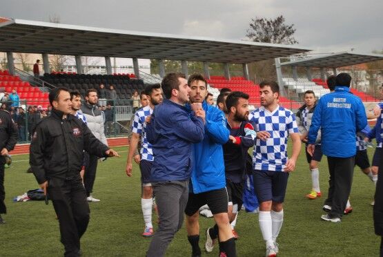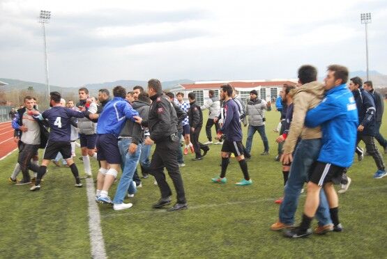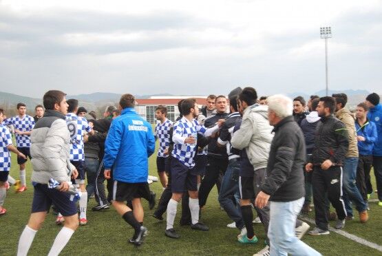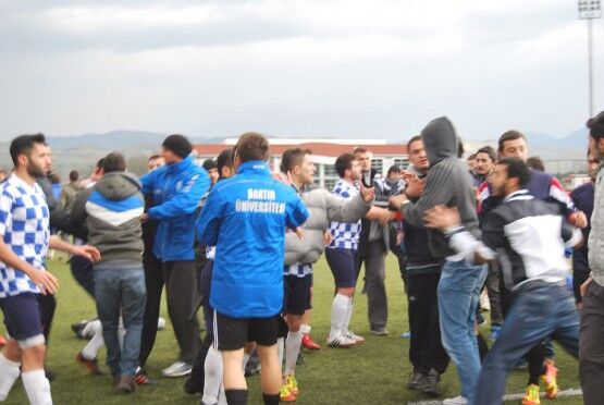 Bartın’da Bartın Üniversitesi ile Bolu izzet Baysal Üniversitesi arasında oynanan Üniversiteler Arası 2.Lig maçı bitiminde iki takım futbolcuları, tekme tokat birbirine girdi. Polis ve Gençlik Hizmetleri ve Spor İl Müdürlüğü Özel Güvenlik Güçleri çıkan kavgayı güçlükle ayırdı. Foto: Muhammet Bayraktar