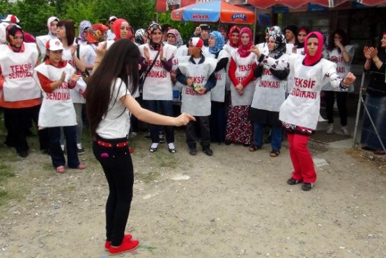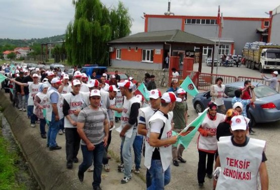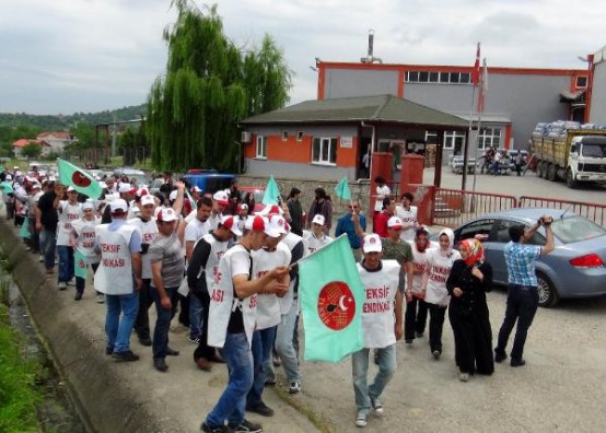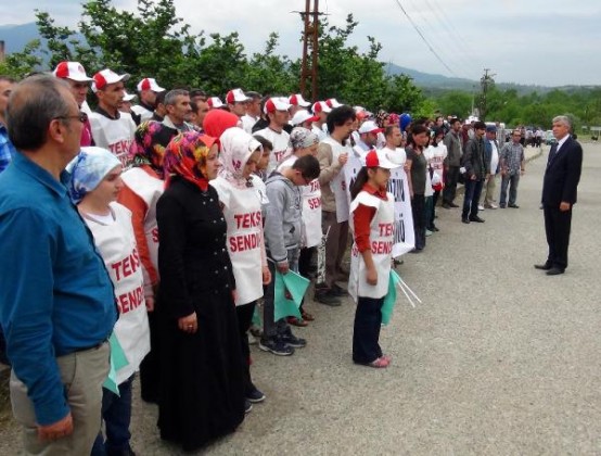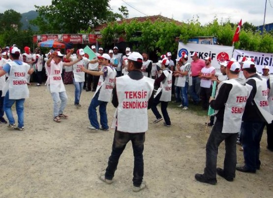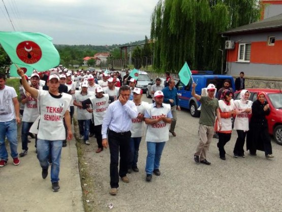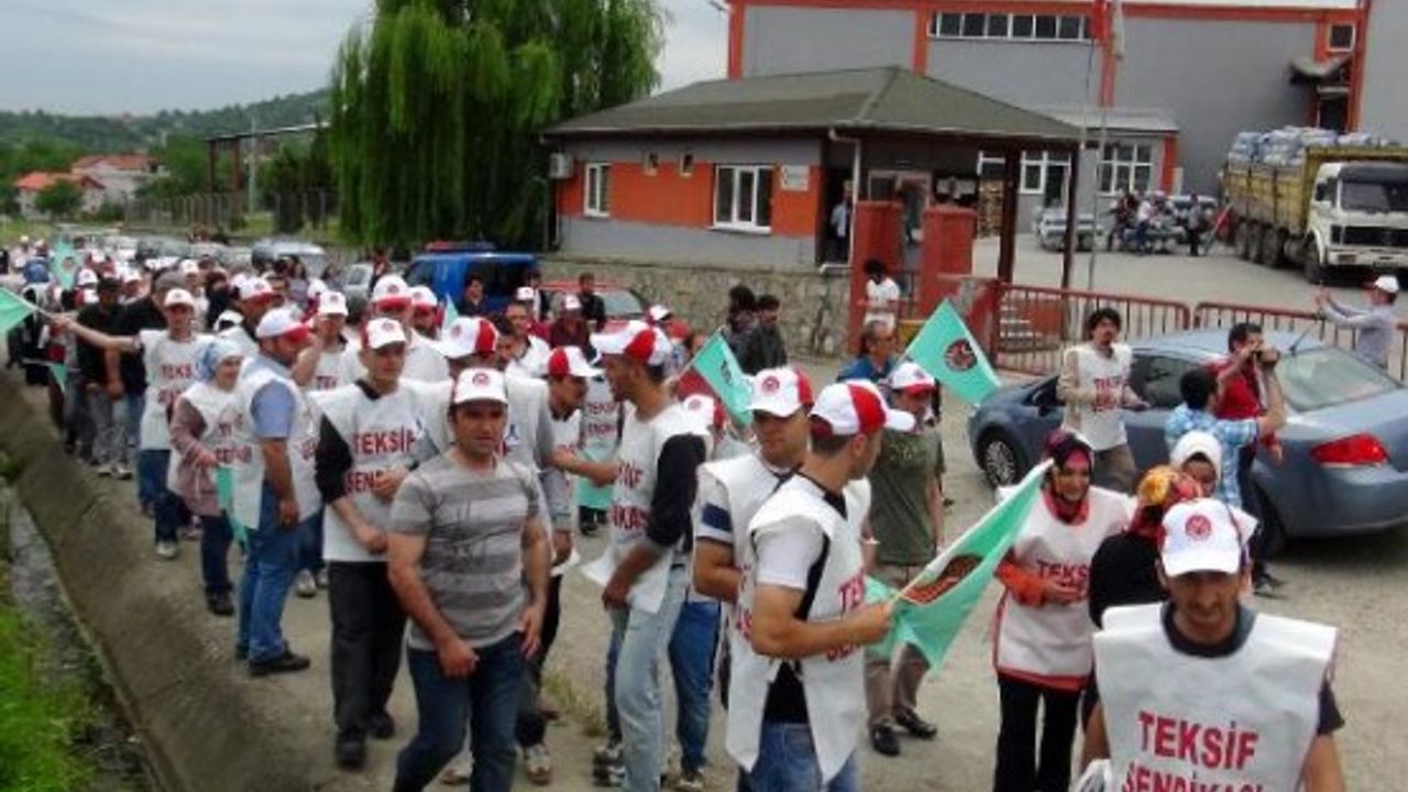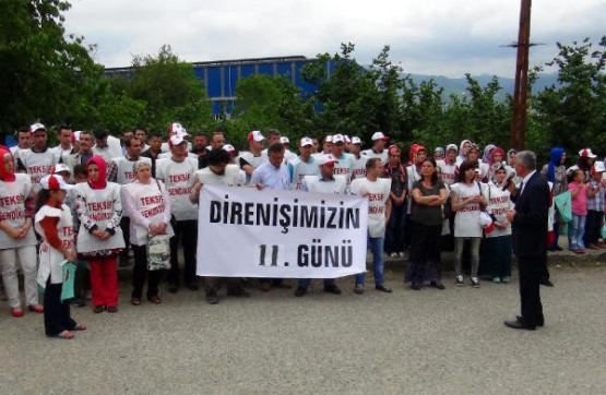 BARTIN'TA TEKSTIL FABRIKASI CALISANLARI, SENDIKAYA UYE OLDUKLARI GEREKCESIYLE ISTEN CIKARILDIGI IDDIA EDILEN 18 ARKADASLARI ICIN IS BIRAKARAK EYLEM YAPTI. FOTO-AYHAN ACAR-BARTIN-DHA