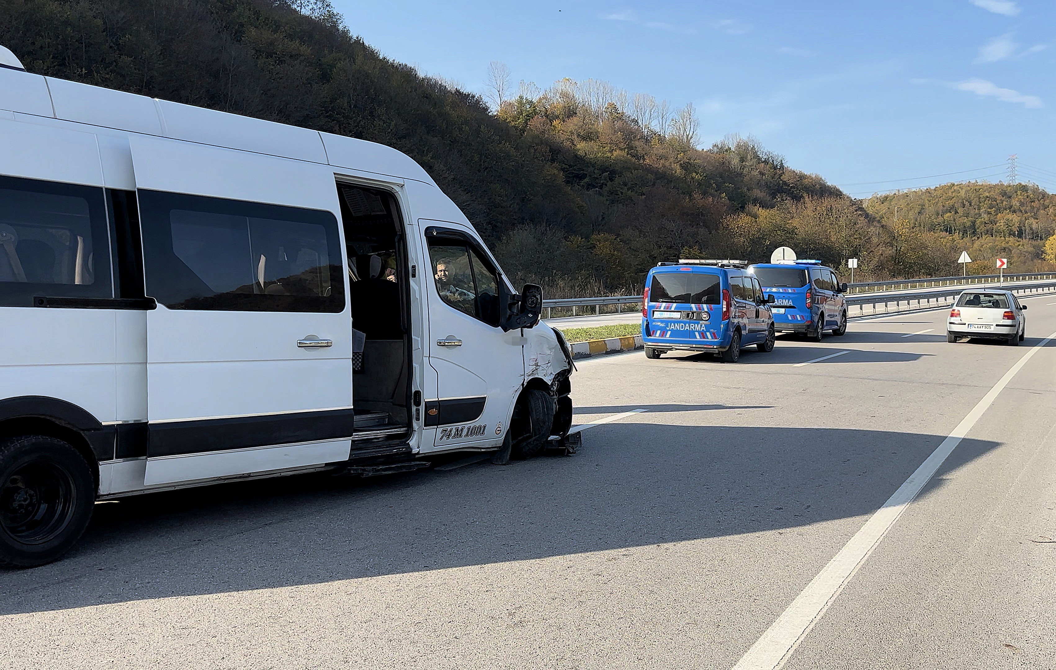 Bartın Amasra ilçesi Uğurlar kavşağında trafik kazası meydana geldi. Kavşak noktasından çıkış yapan 74 BG 211 plakalı otomobil, seyir halindeki 74 M 1001 plakalı yolcu minibüsüne çarptı.