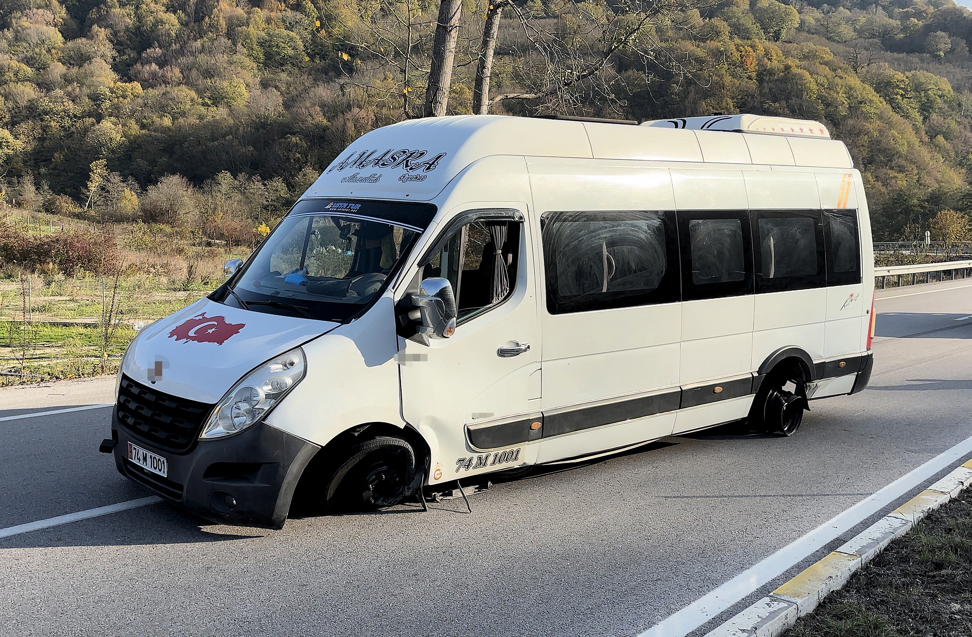 Yaşanan kazada minibüsün 2 tekerinin de yarılması kazanın şiddetini gözler önüne serdi.