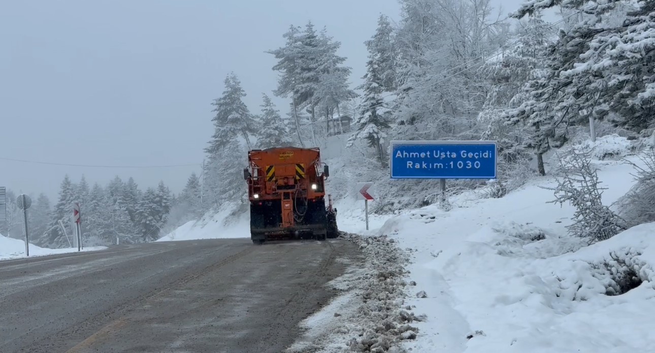 Kar yağışı ve sisin etkili olduğu bölgede oluşan manzara havadan görüntülenirken, Karayolları ekipleri de ulaşımda aksama yaşanmaması için kar küreme ve tuzlama çalışması gerçekleştirdi.