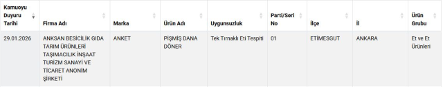 Denetim sonuçlarına göre, zincir marketlerde kampanyalı olarak satışa sunulan “Anket Pişmiş Dana Döner” ürününde tek tırnaklı et (at ve eşek eti) bulundu. Ürünün etiketinde “dana döner” ibaresi yer almasına rağmen, yapılan analizlerde mevzuata aykırı içerik tespit edildiği bildirildi.