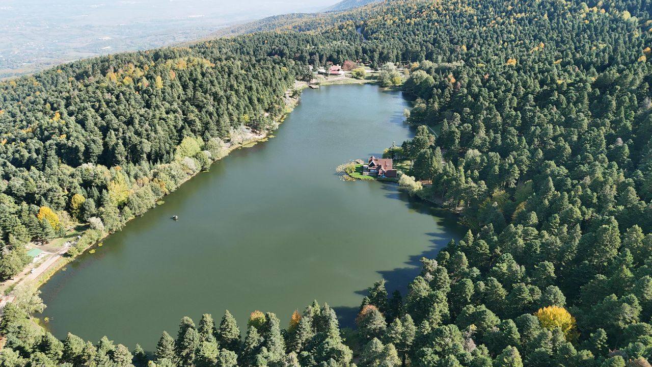 BOLU’da çam ormanları arasındaki Gölcük Tabiat Parkı’nda sonbaharda yaprakları sarı ve kahverengiye dönmeye başlayan ağaçların eşsiz manzarası dronla görüntülendi.