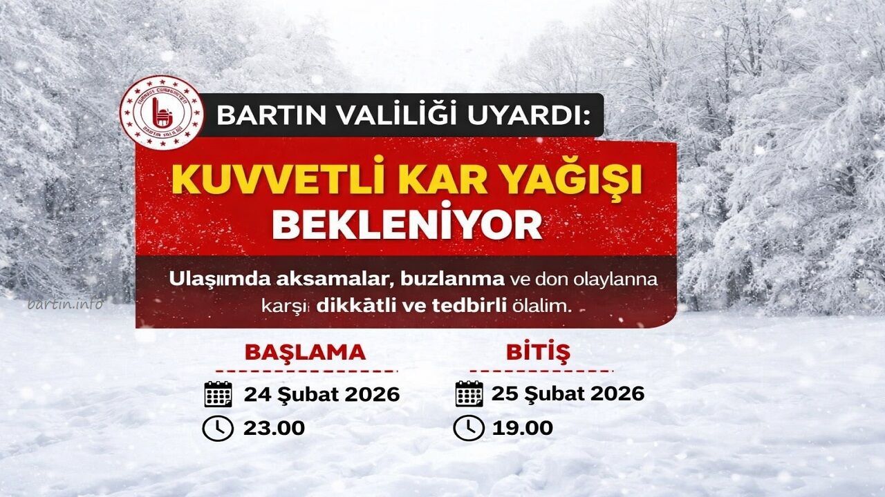 Bartın Valiliği tarafından yapılan açıklamaya göre il genelinde kuvvetli kar yağışı bekleniyor.