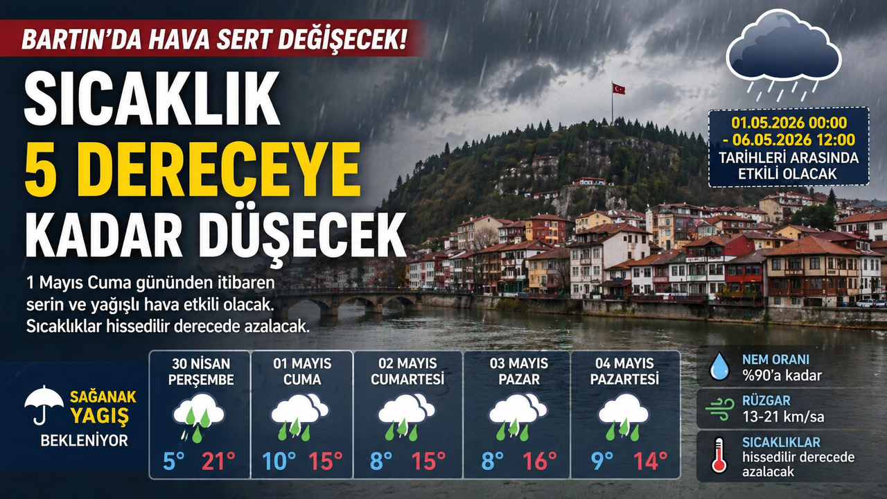 Meteoroloji Genel Müdürlüğü'nün son değerlendirmelerine göre, Bartın'da 1 Mayıs Cuma gününden itibaren serin ve yağışlı hava etkili olacak.